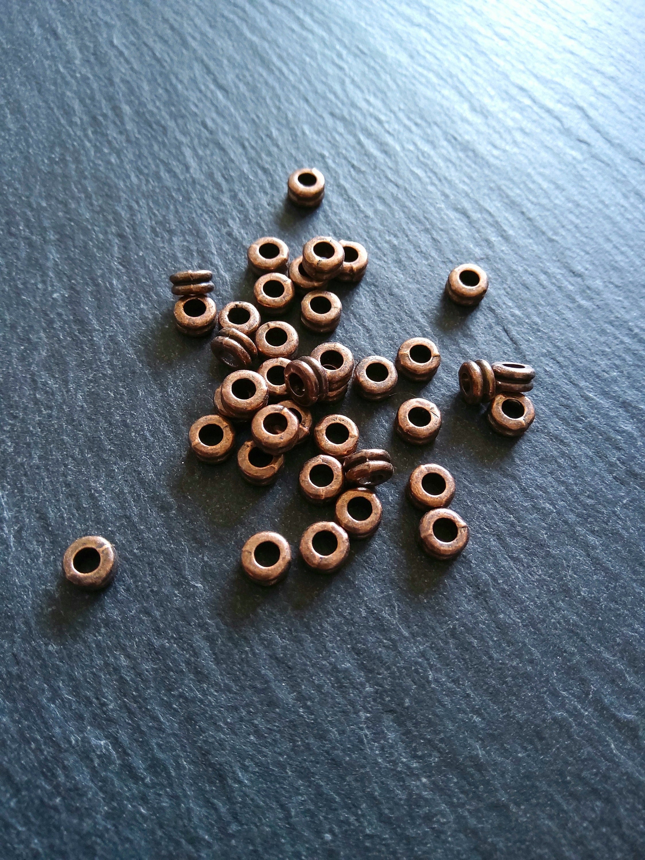 Antique Copper tone 'Macaron' shaped spacer beads, with a groove around the middle.