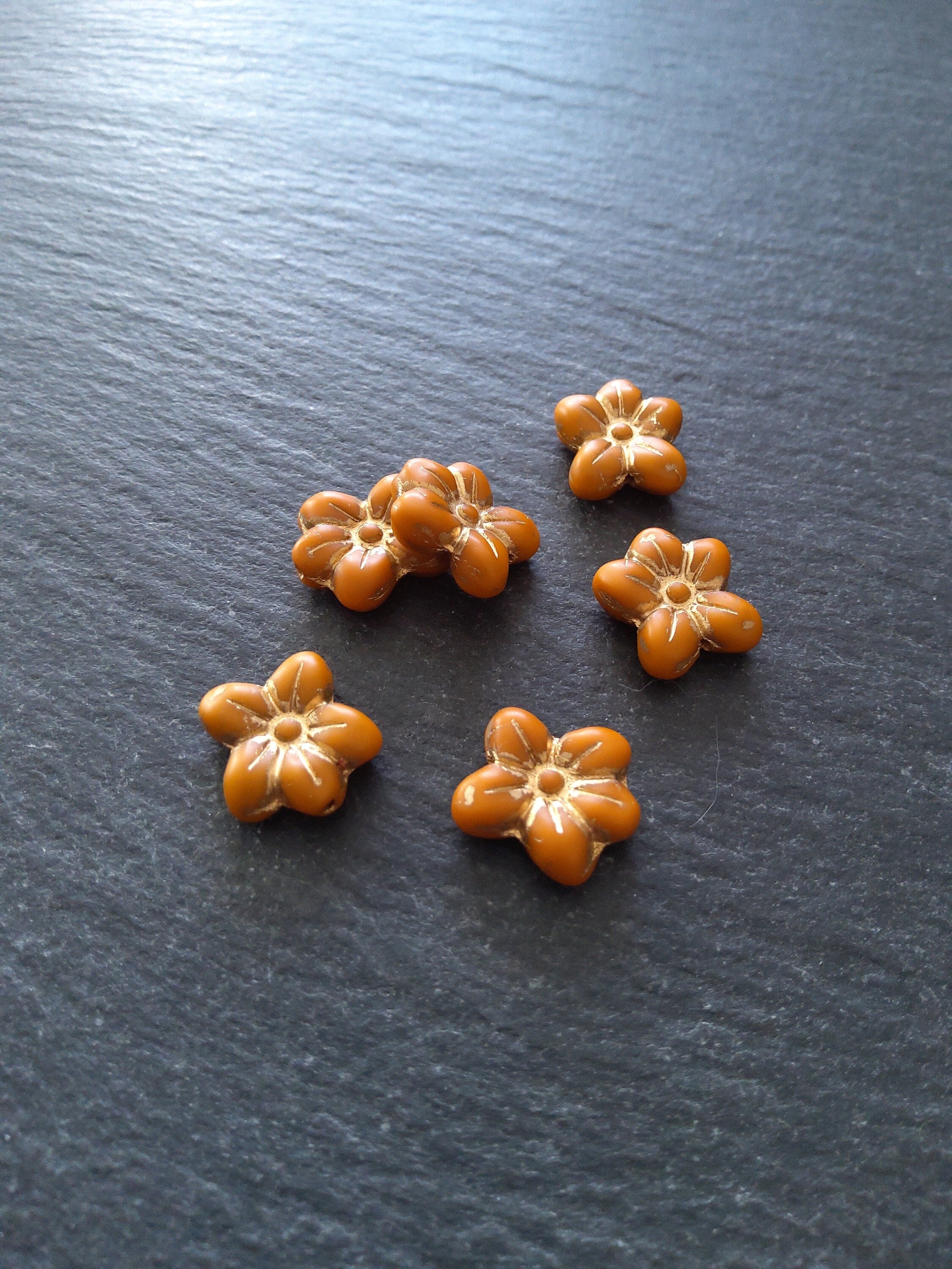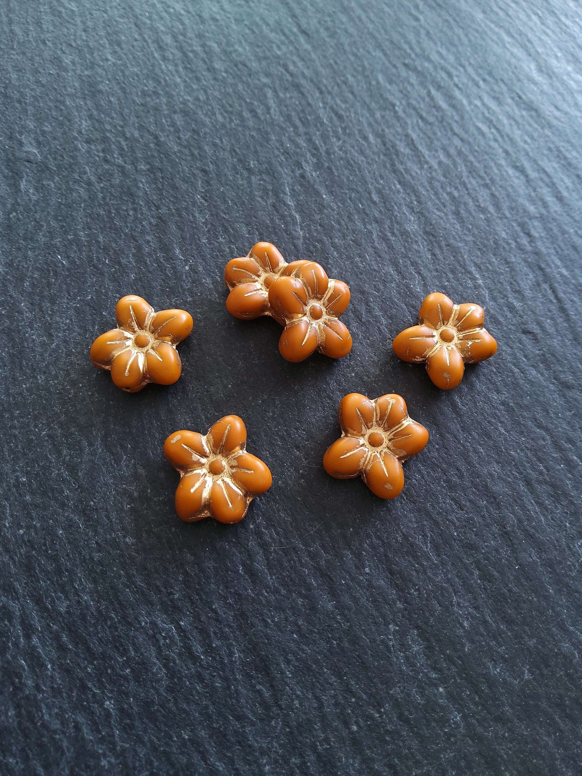 Pressed Czech Glass Pumpkin Orange Flower Beads from the family run factory in the Czech Republic.