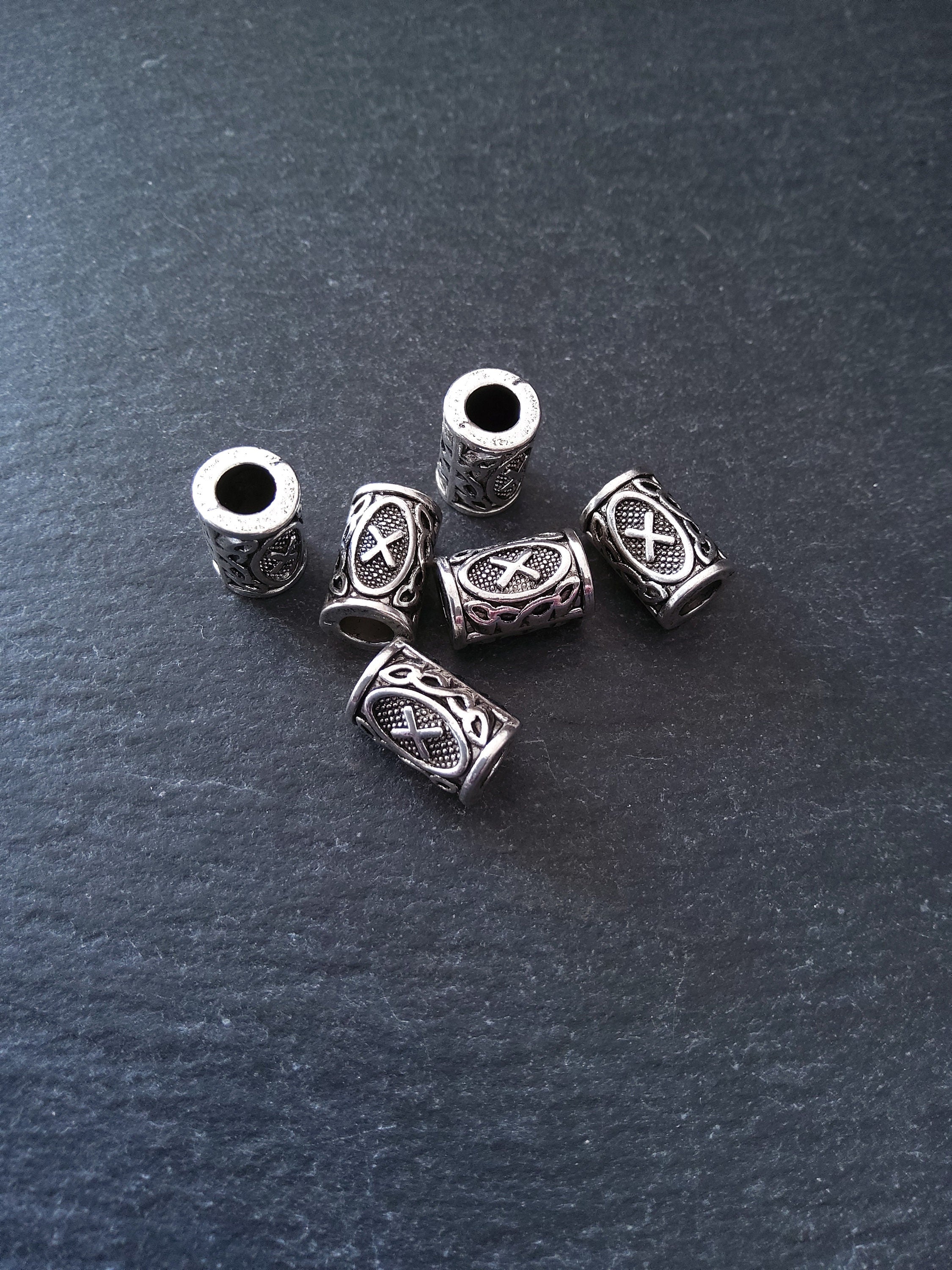 Solid antique silver tone zinc metal alloy cylinder beads with the Gebo X rune, which means 'Gift'.