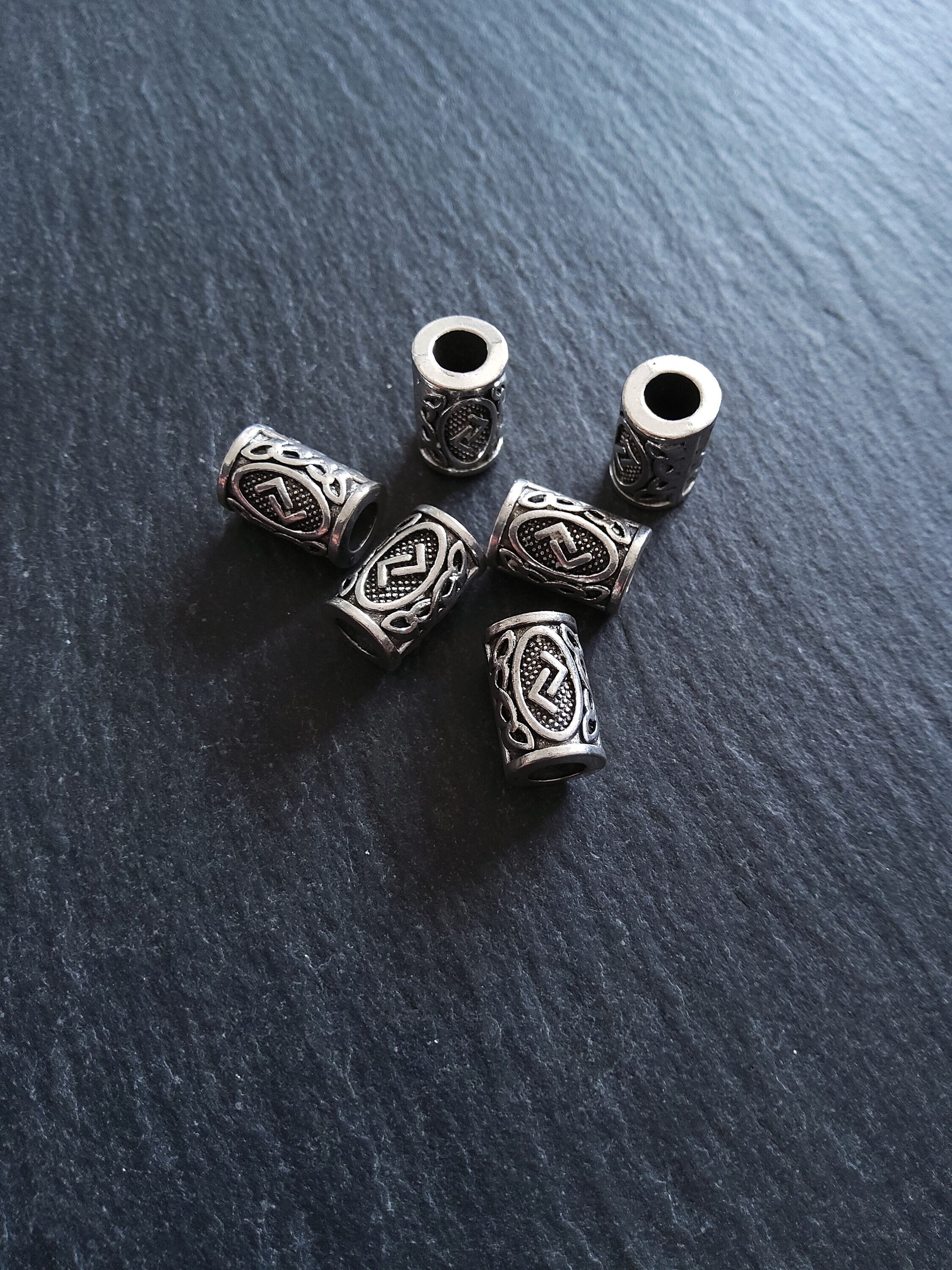 Solid antique silver tone zinc metal alloy cylinder beads with the Jera ᛃ rune, which means 'Year' or 'Harvest'.