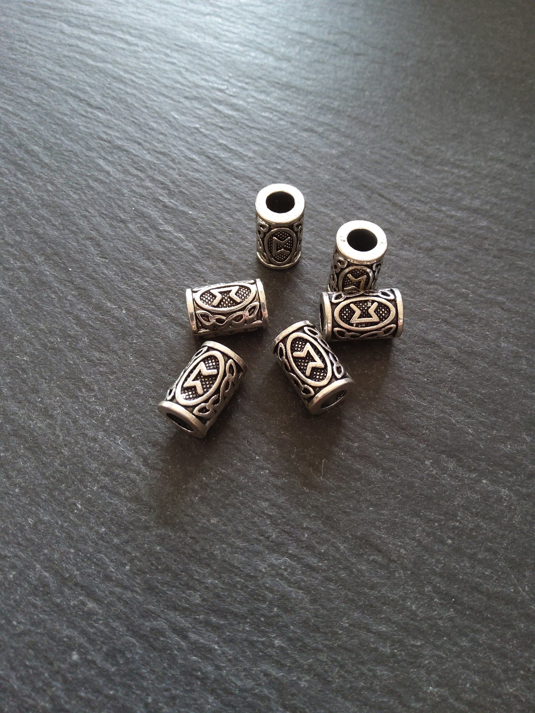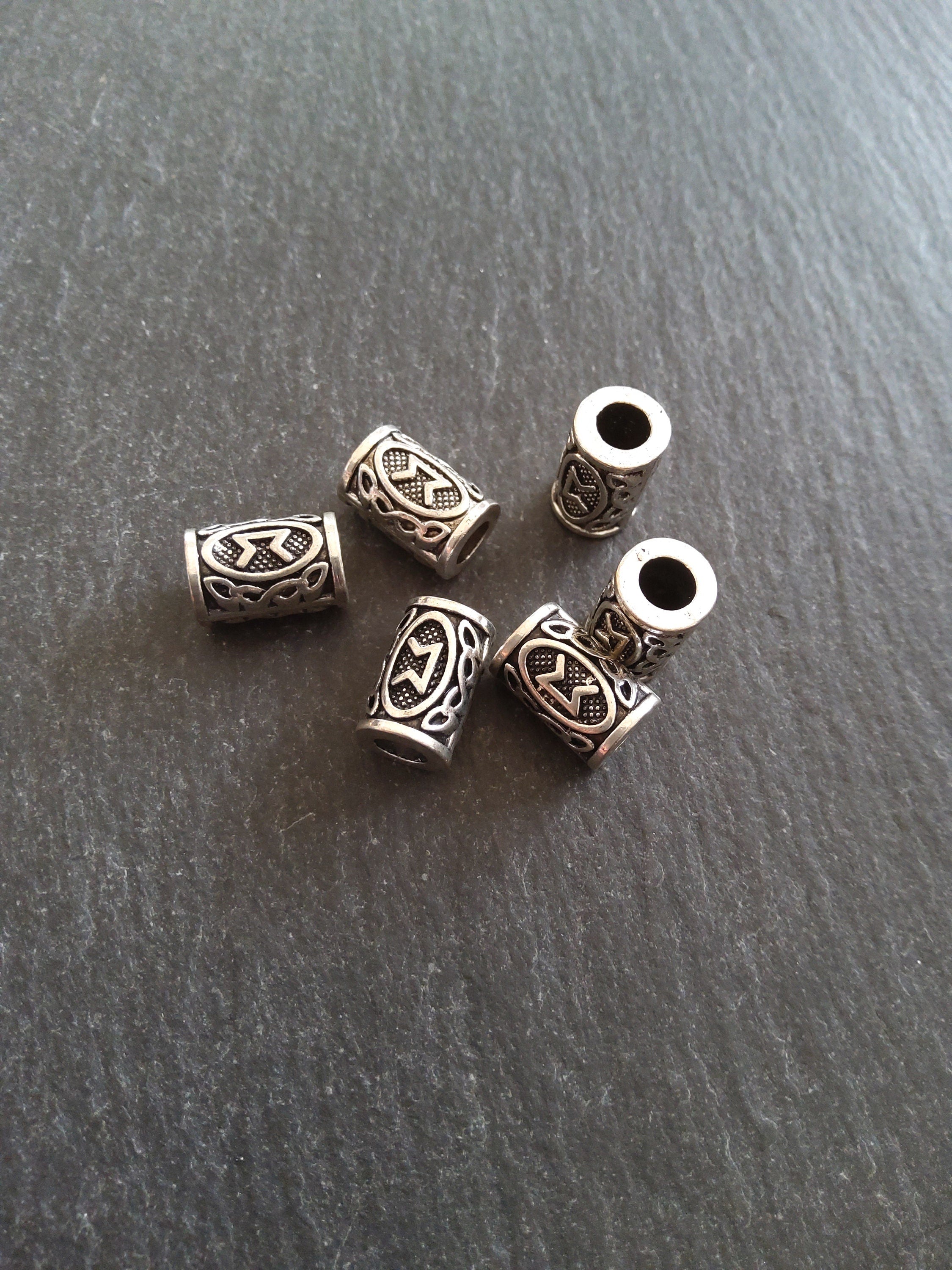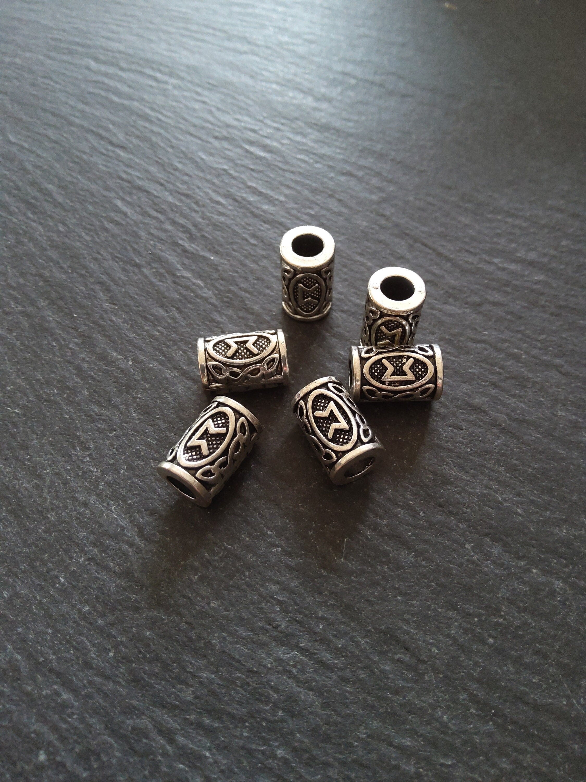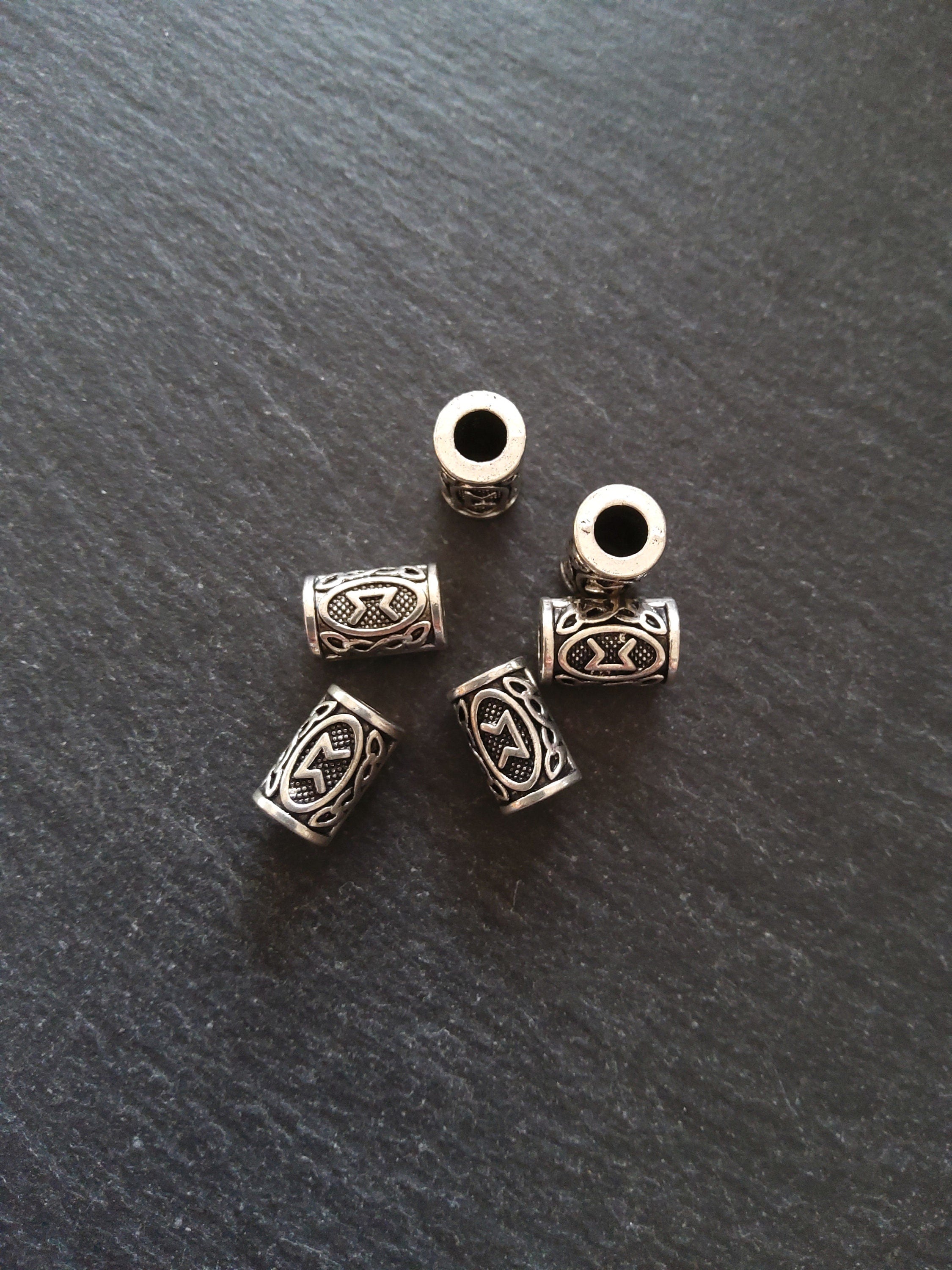 Solid antique silver tone zinc metal alloy cylinder beads with the Perthro ᛈ Rune, which means 'Fate'.
