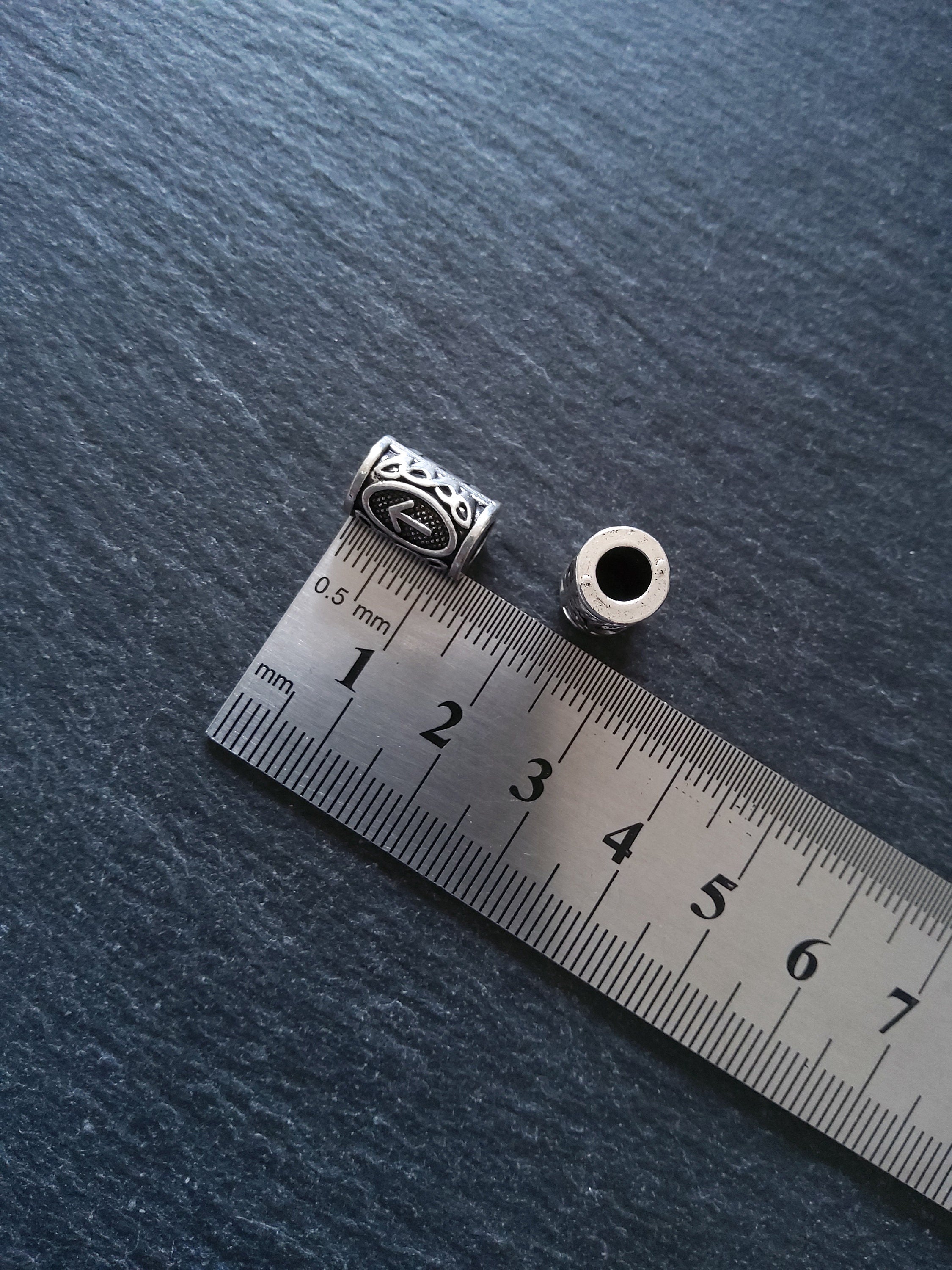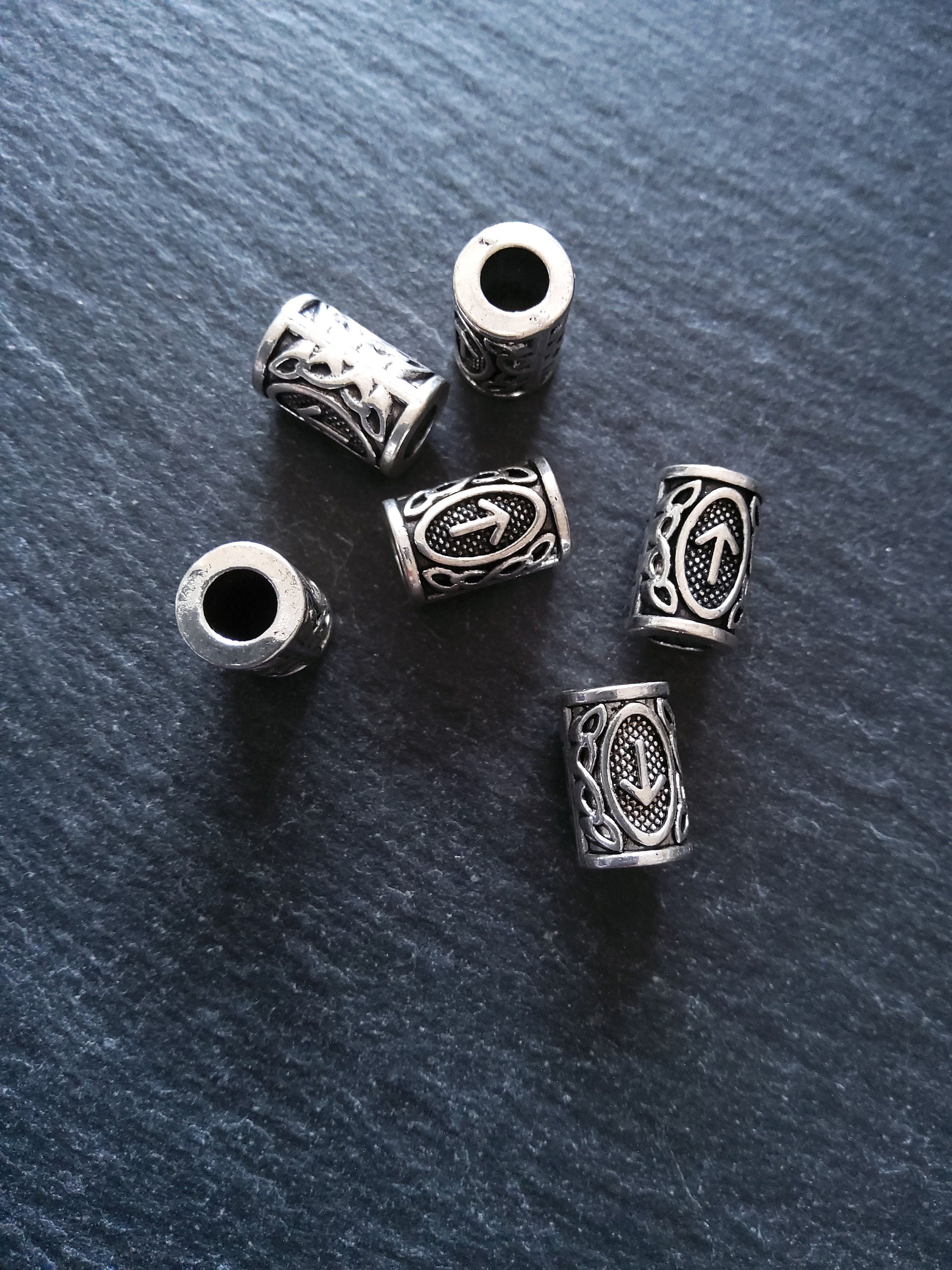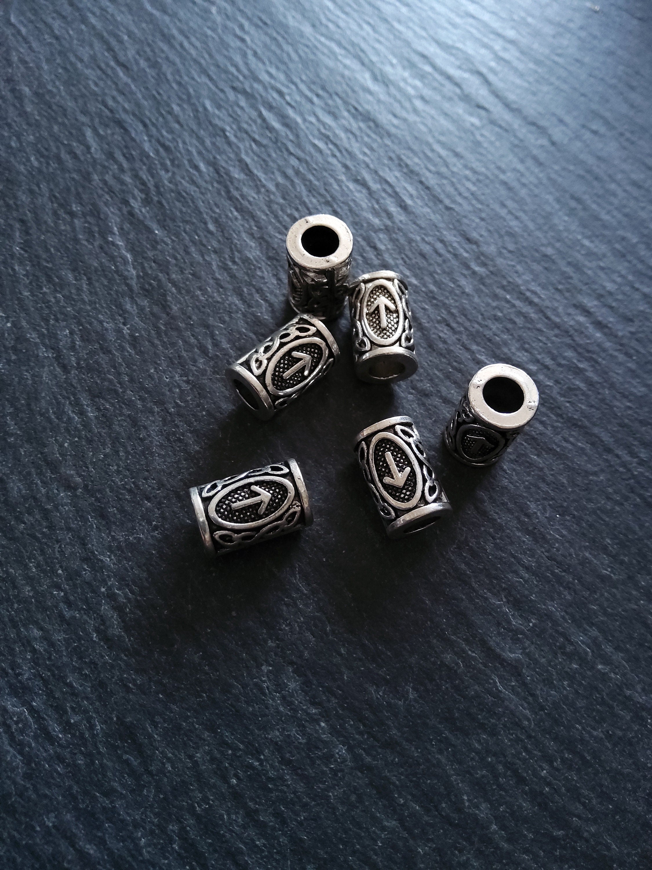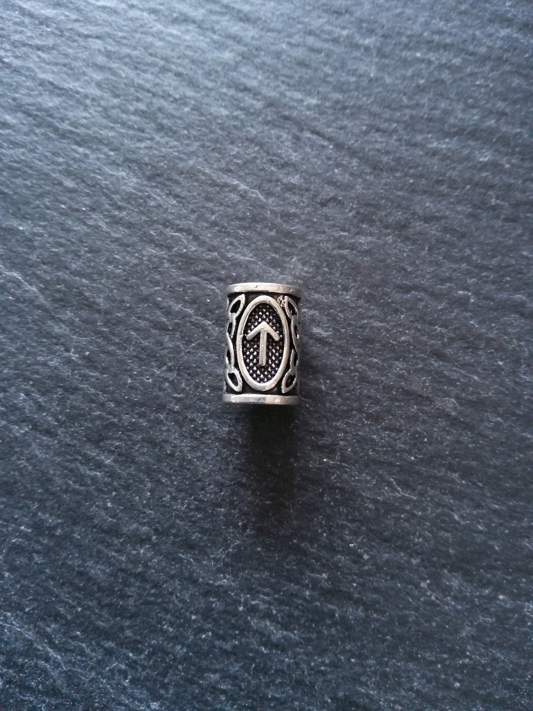 Solid antique silver tone zinc metal alloy cylinder beads with the Tiwaz (ᛏ) or Týr Rune, which means 'Spear'.