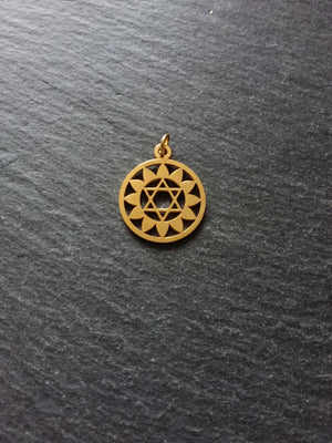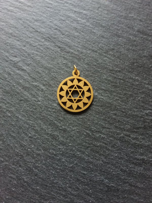 Flat round 304 golden stainless steel pendants or charms. Anahata or heart chakra with star design.