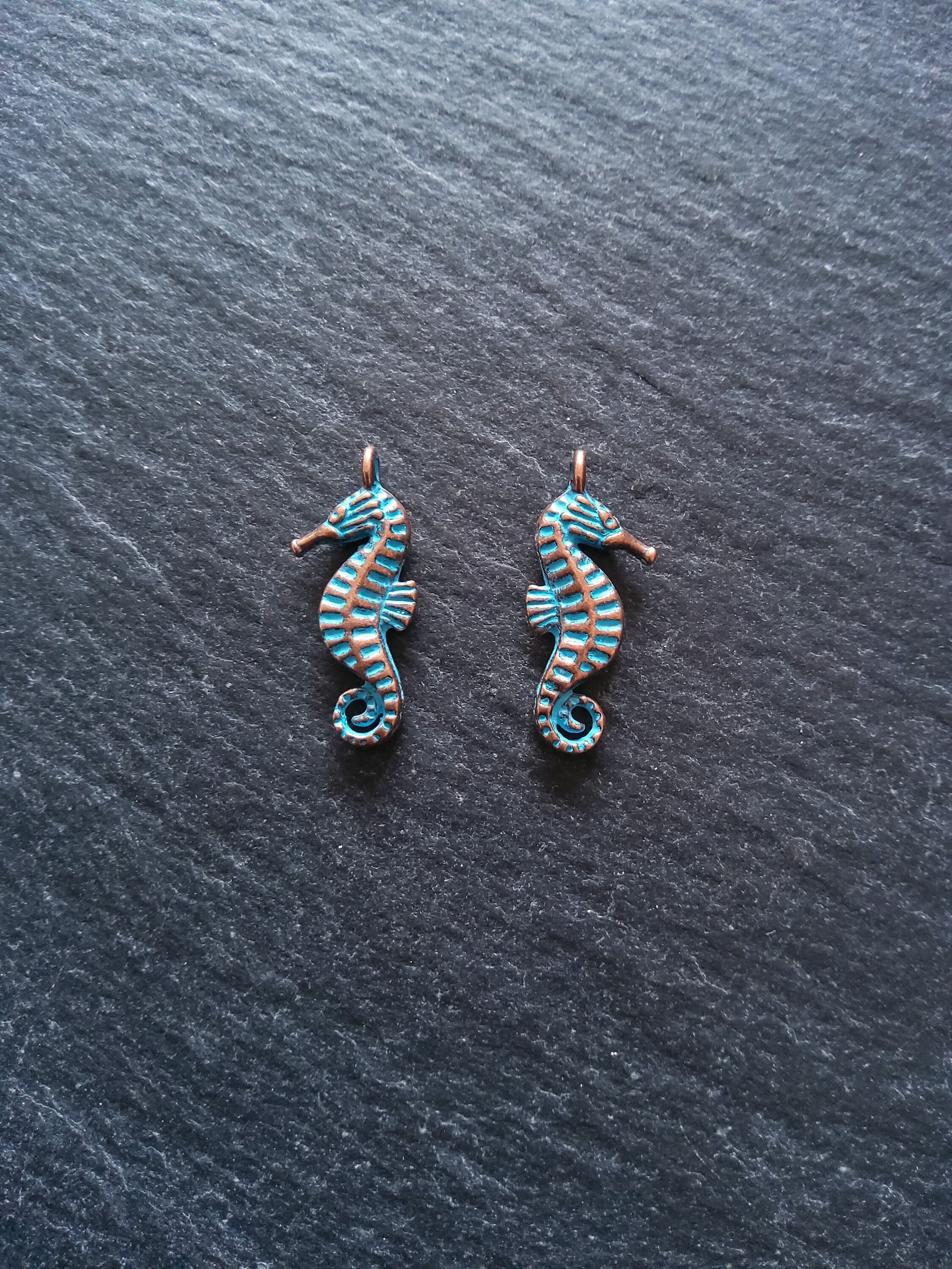 Antique copper tone zinc metal alloy seahorse charms with a blue patina.