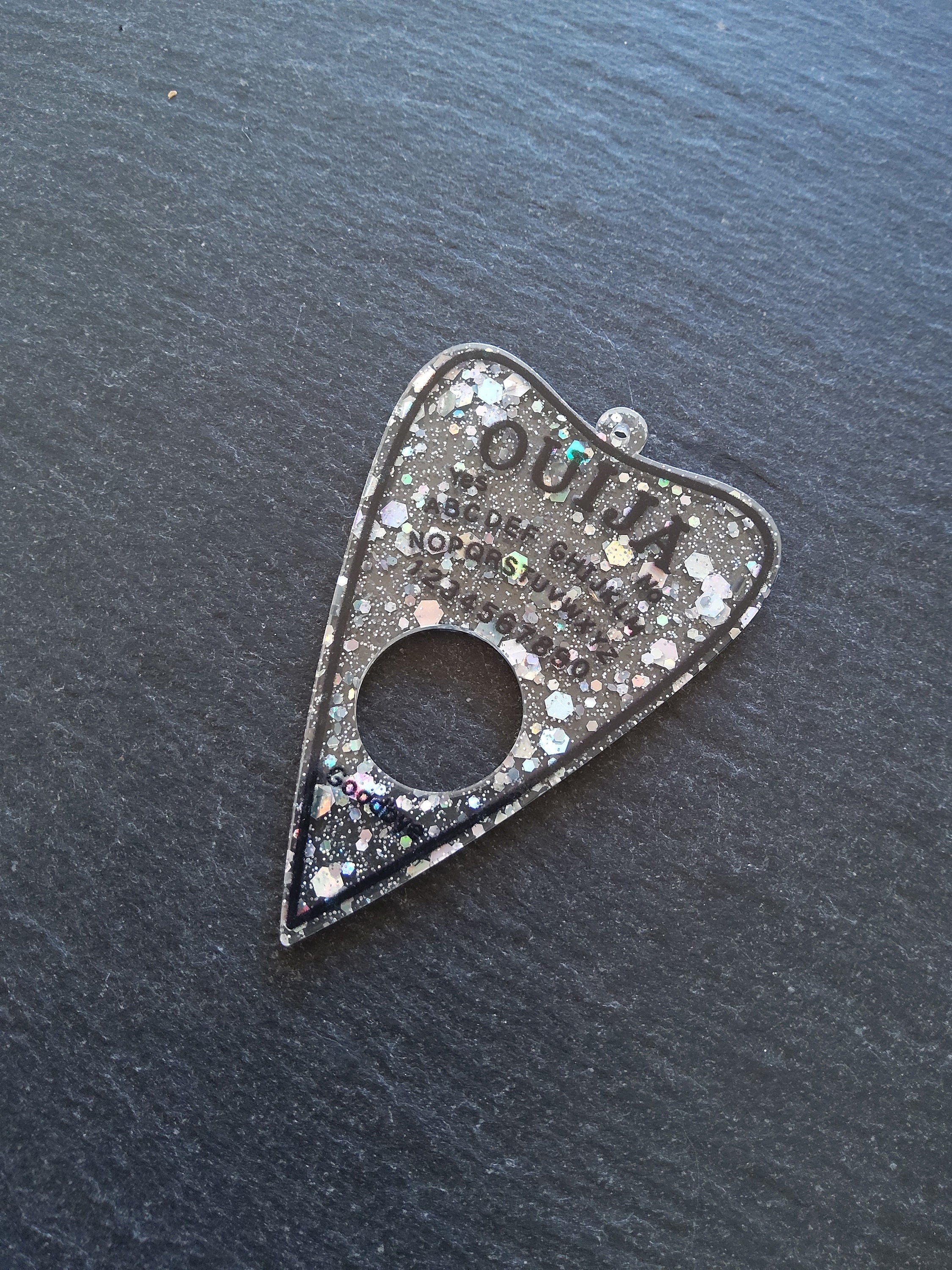 Large clear acrylic heart-shaped Ouija Planchette charmswith rainbow-silver glitter sparkles.