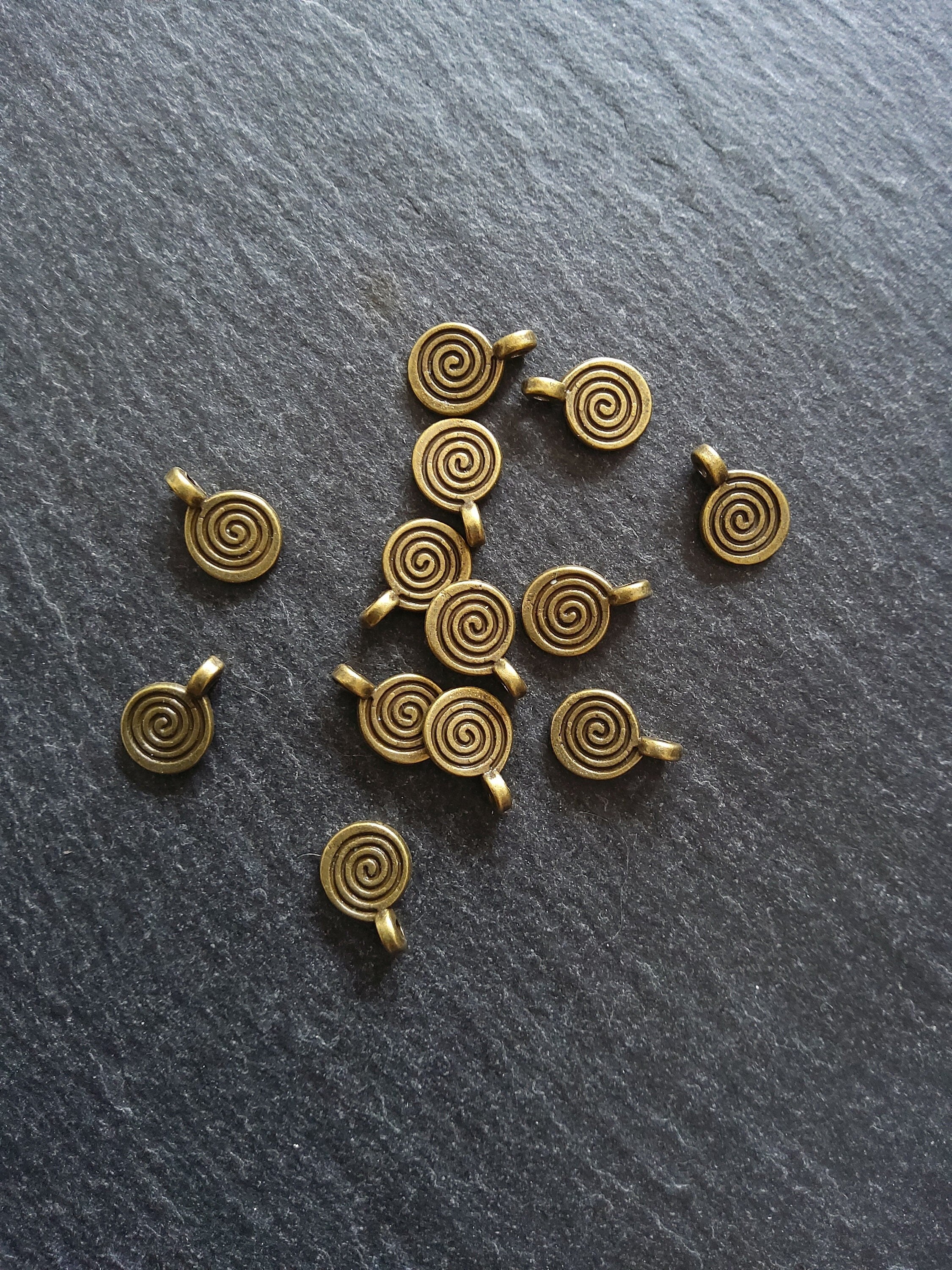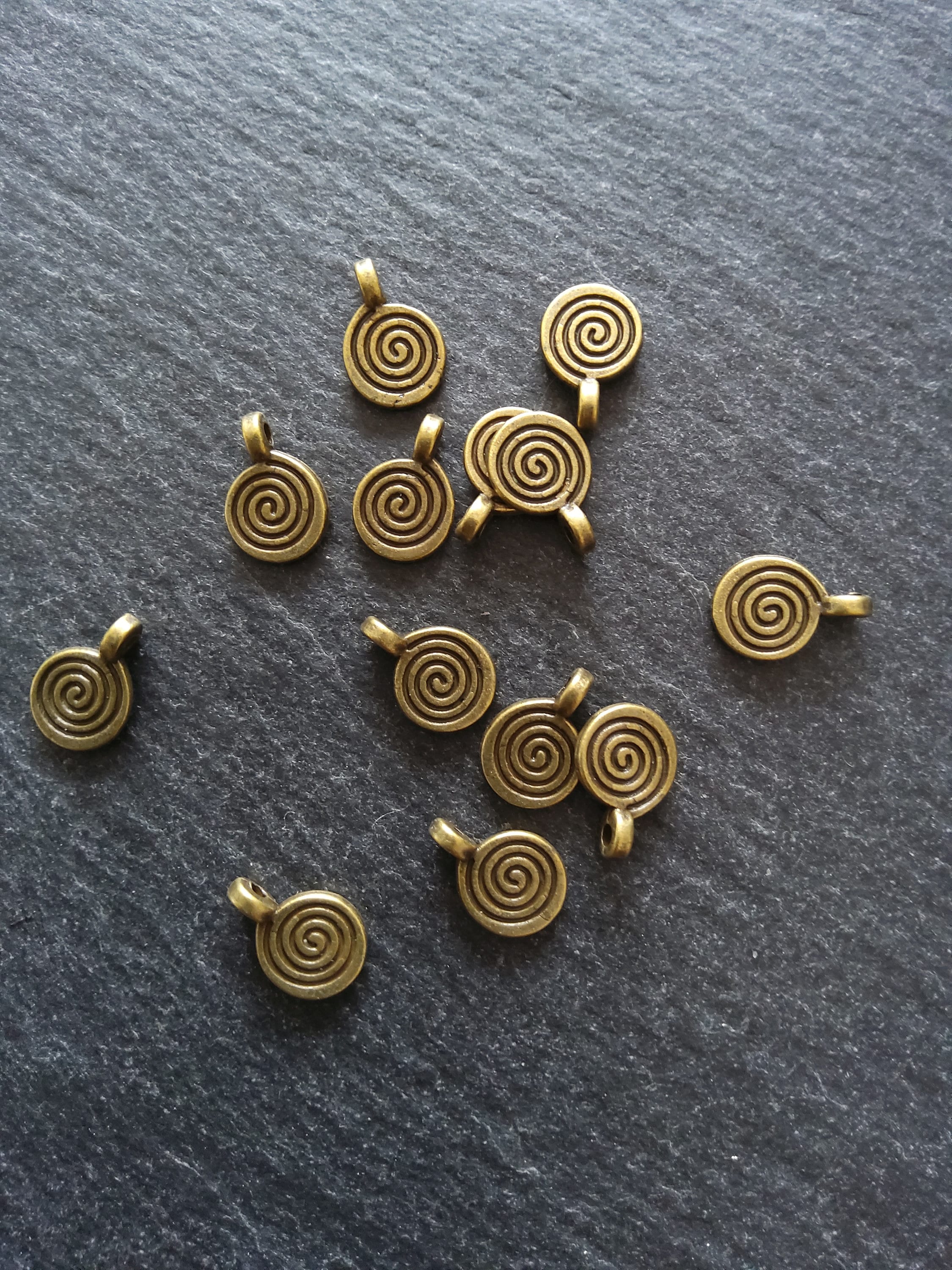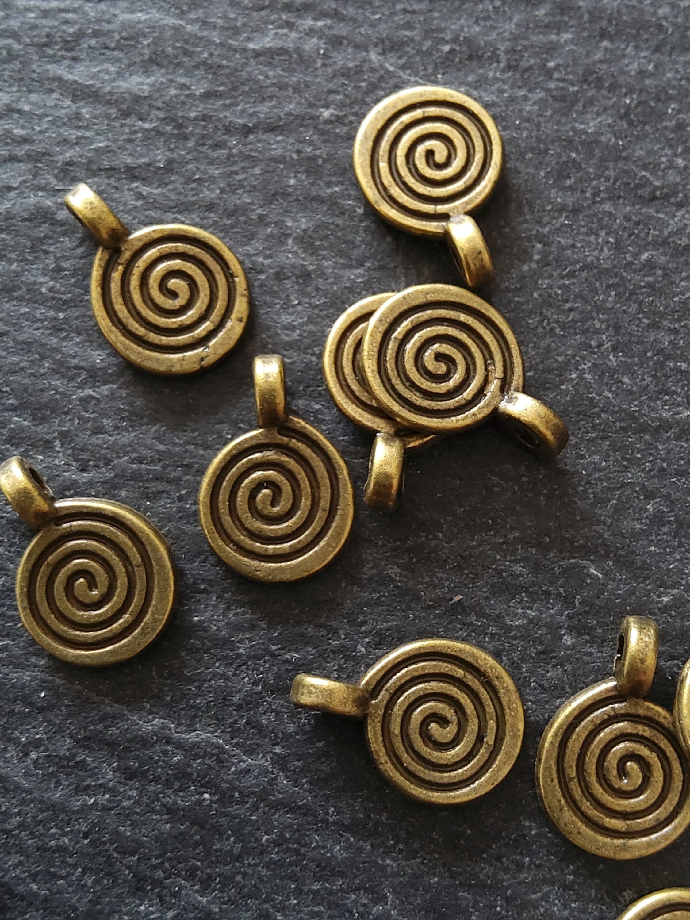 Round swirl pendant charms antique bronze tone metal alloy. Can be used as stick-on bails.