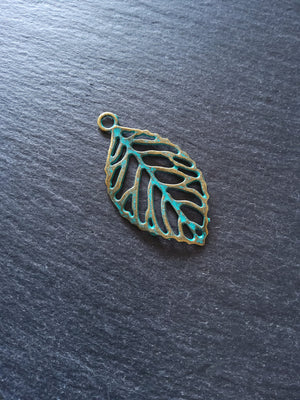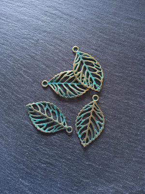 Antique bronze tone leaf alloy charms with green patina. Pierced design.