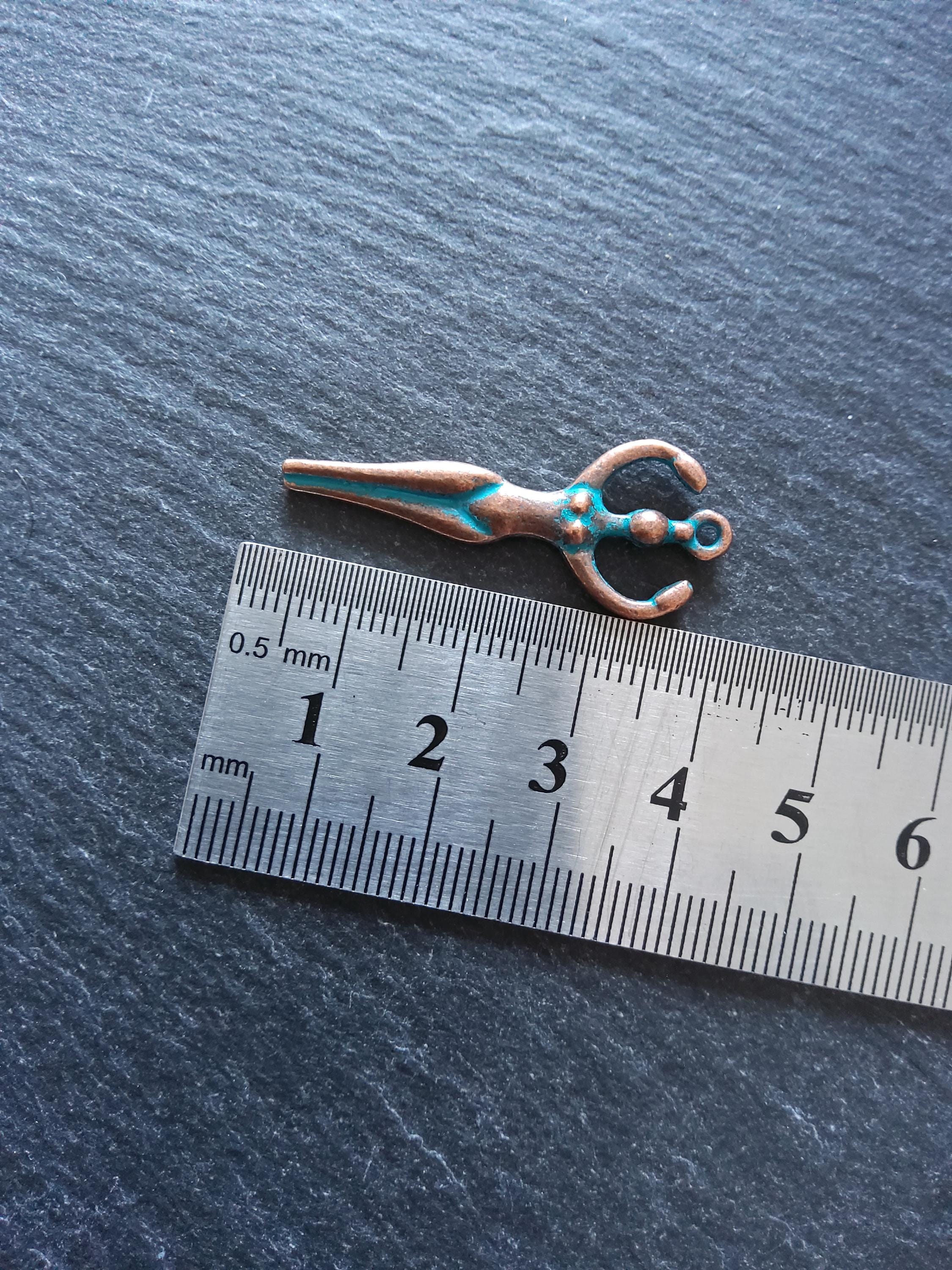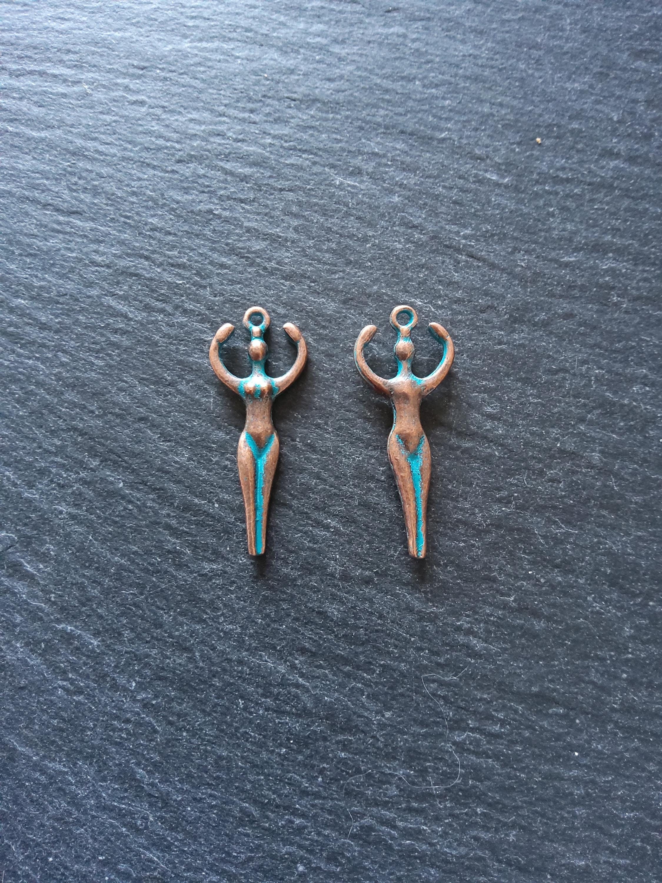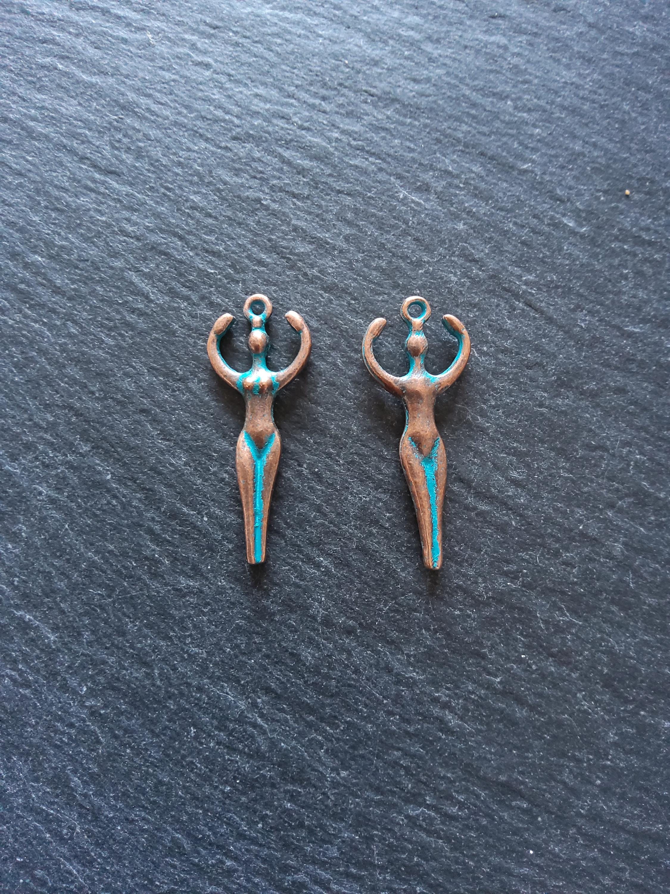 Antique copper tone zinc metal alloy goddess pendant with blue patina.