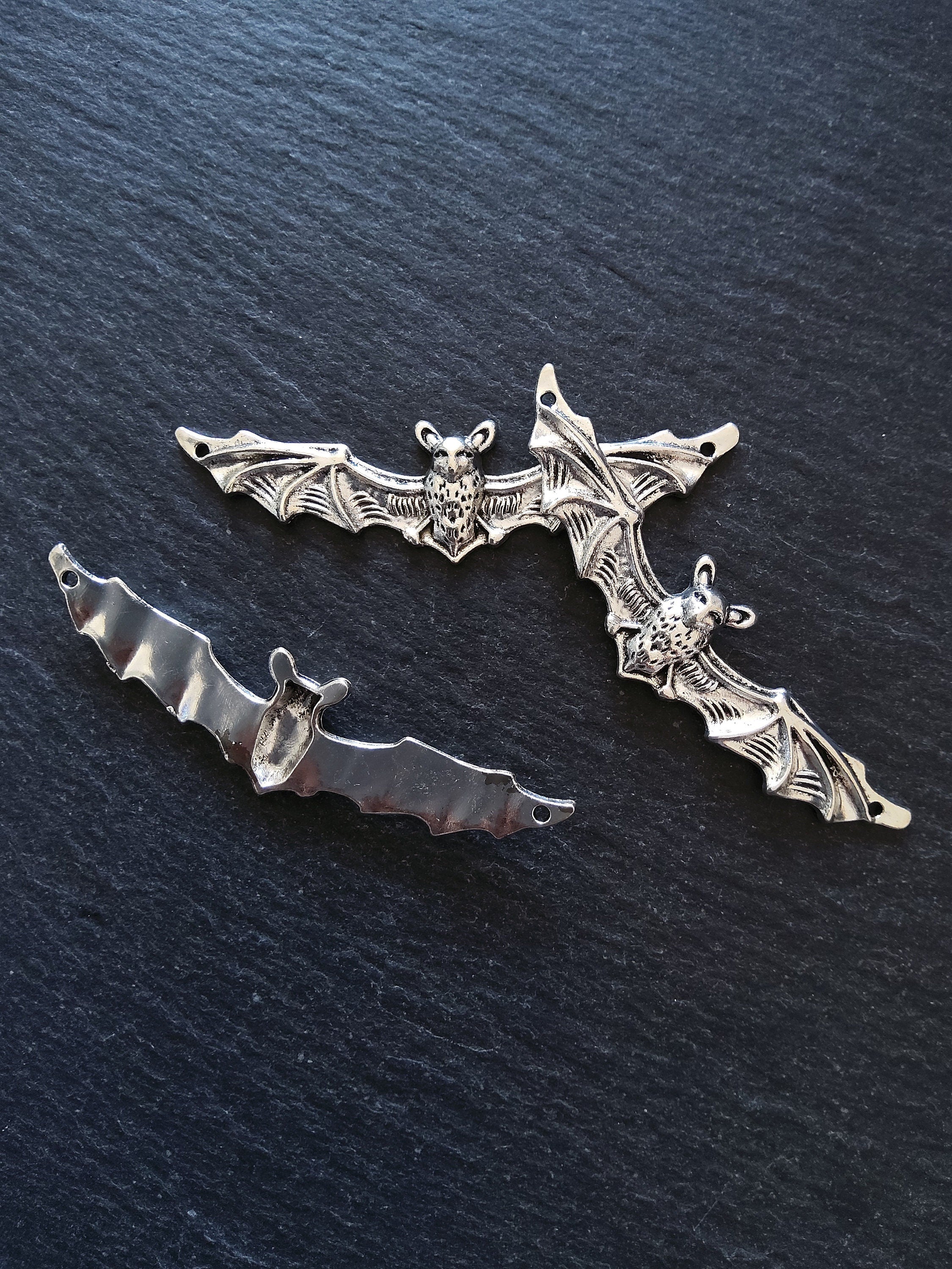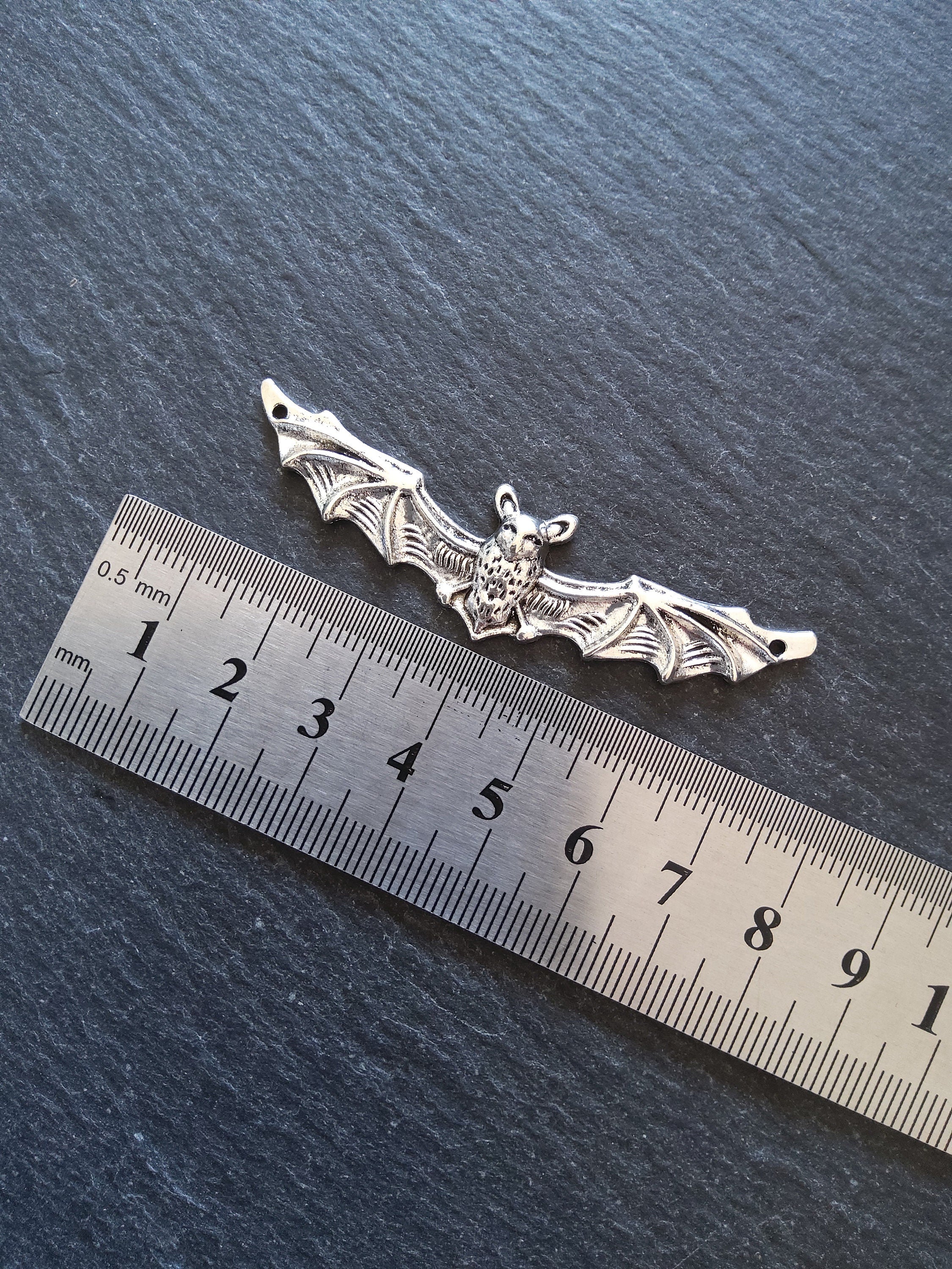 Flying bat connector pendant in antique silver tone zinc metal alloy.