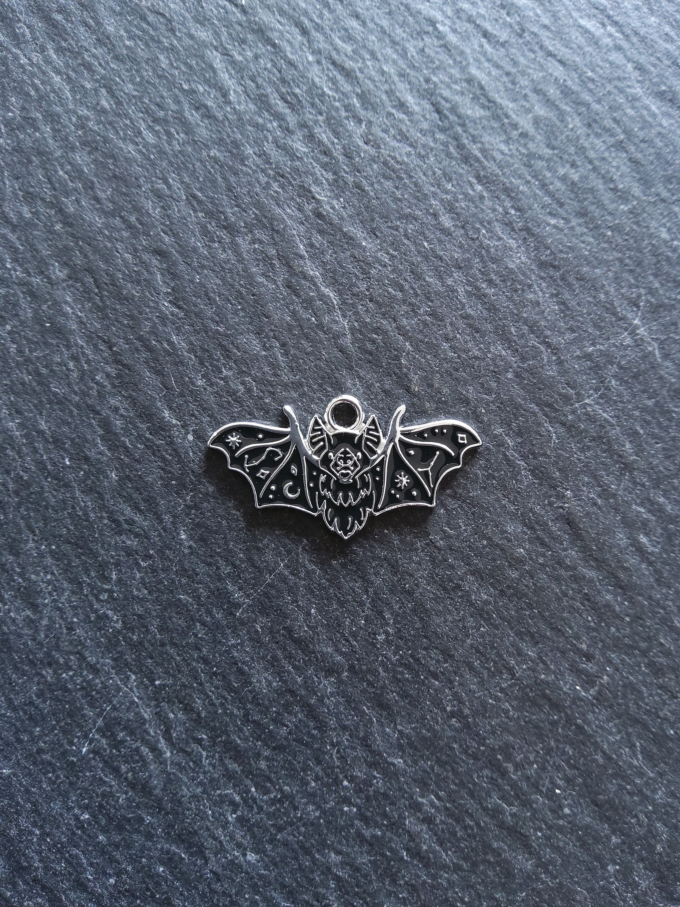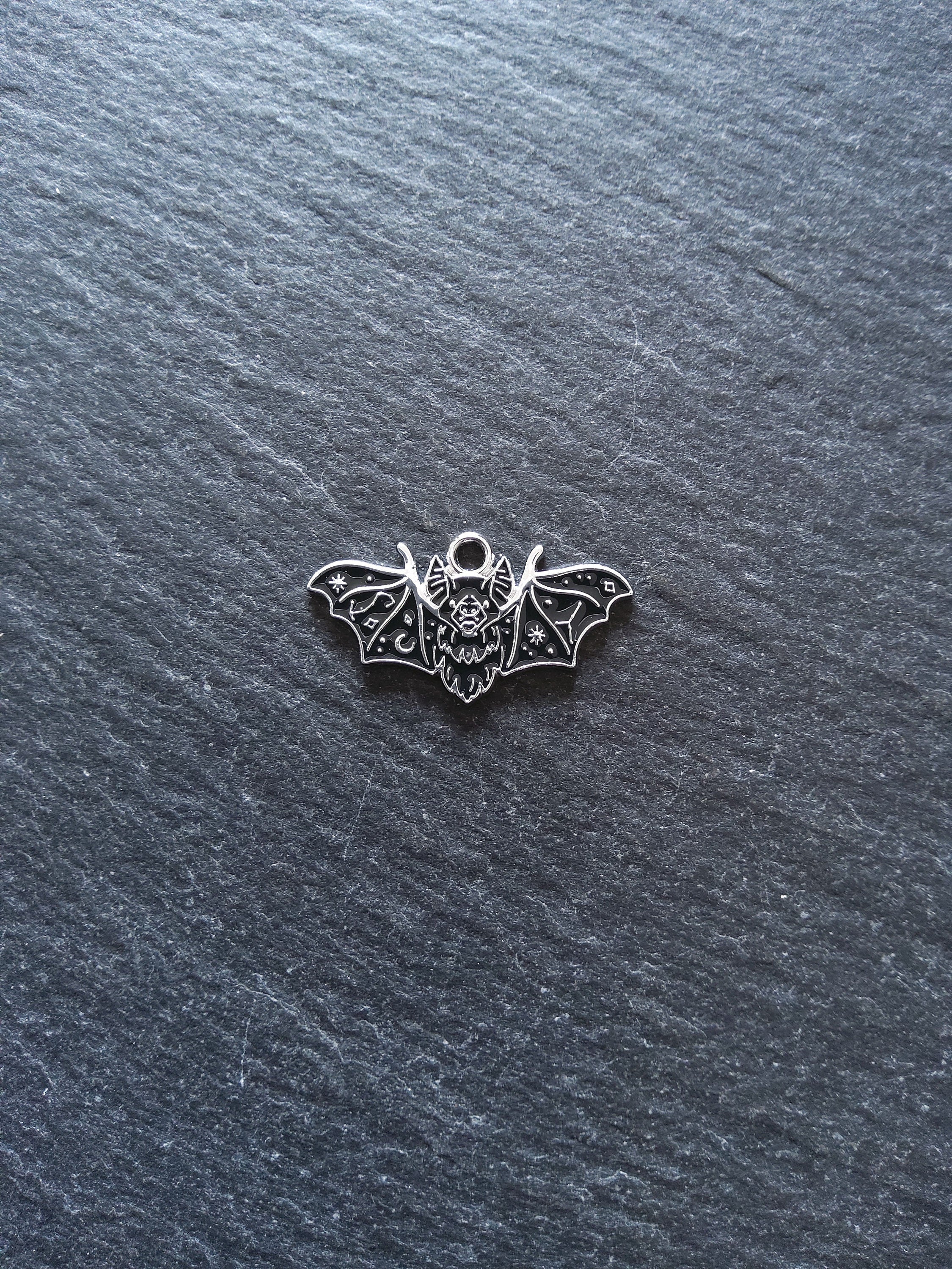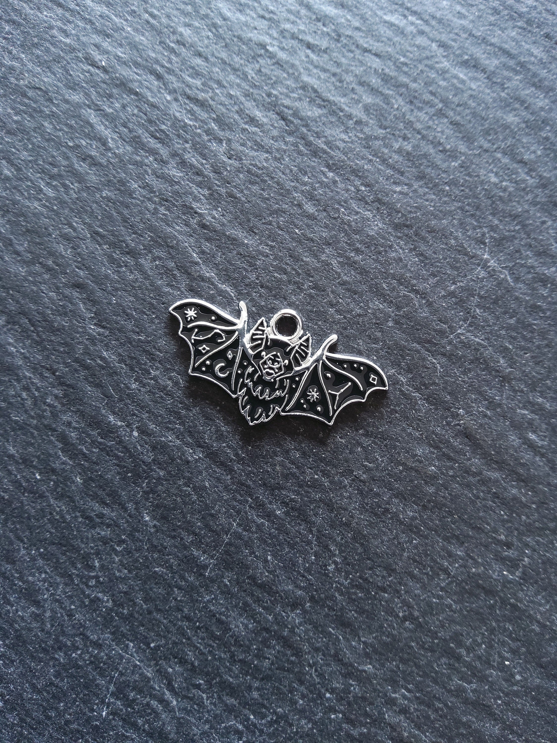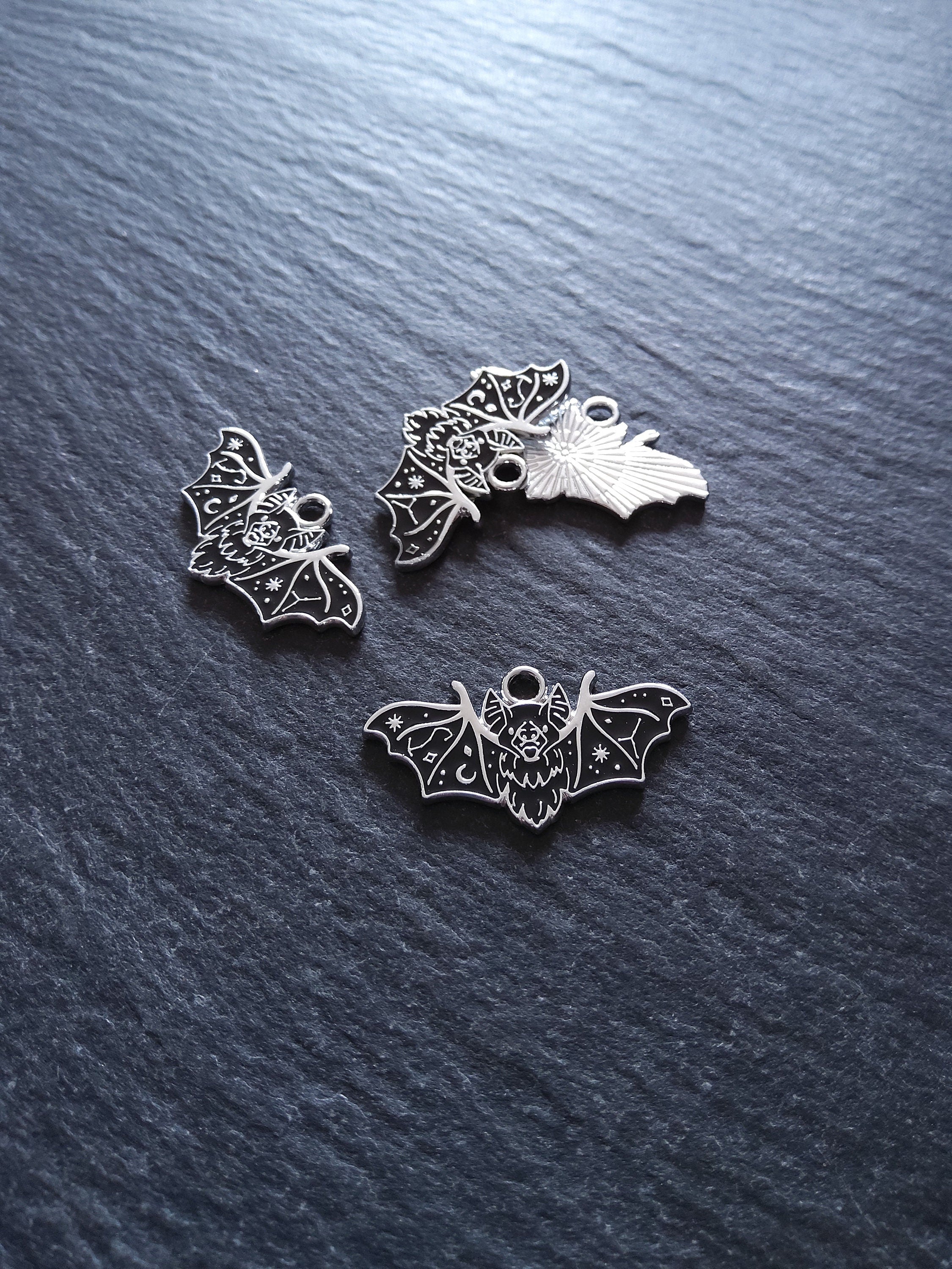 Vampire bat pendants in antique silver tone zinc metal alloy with black enmel.