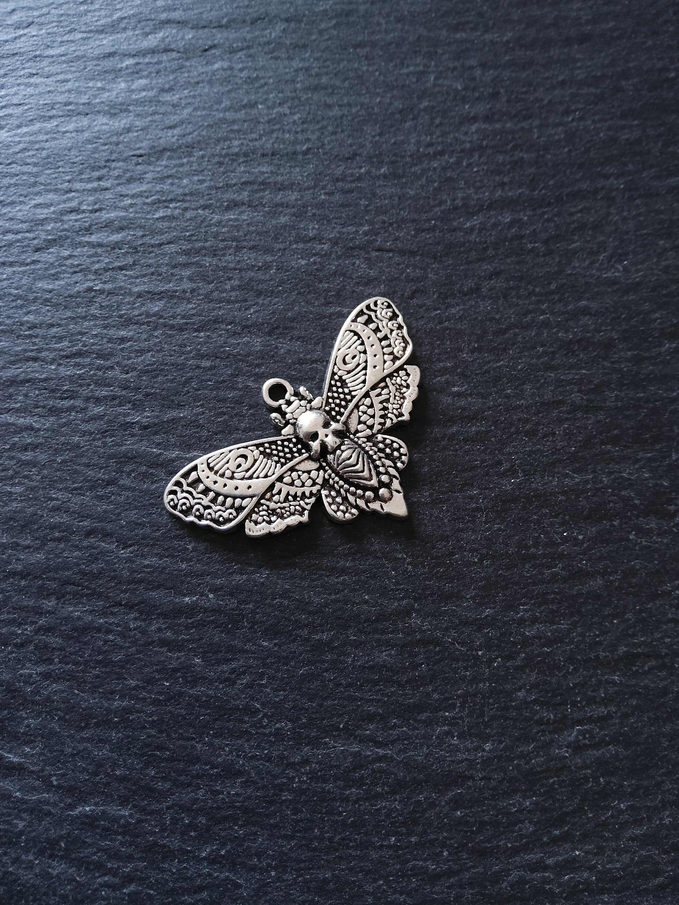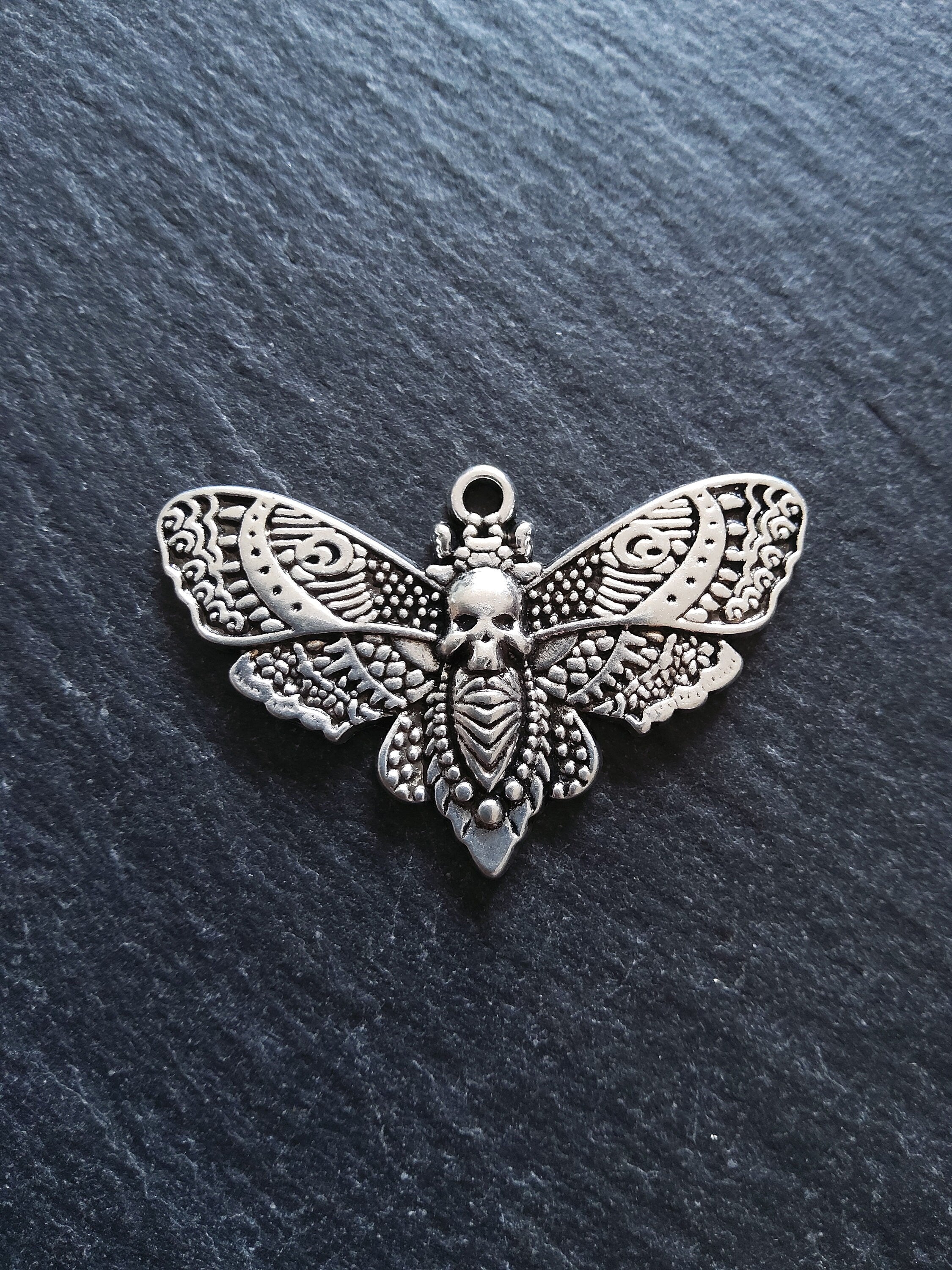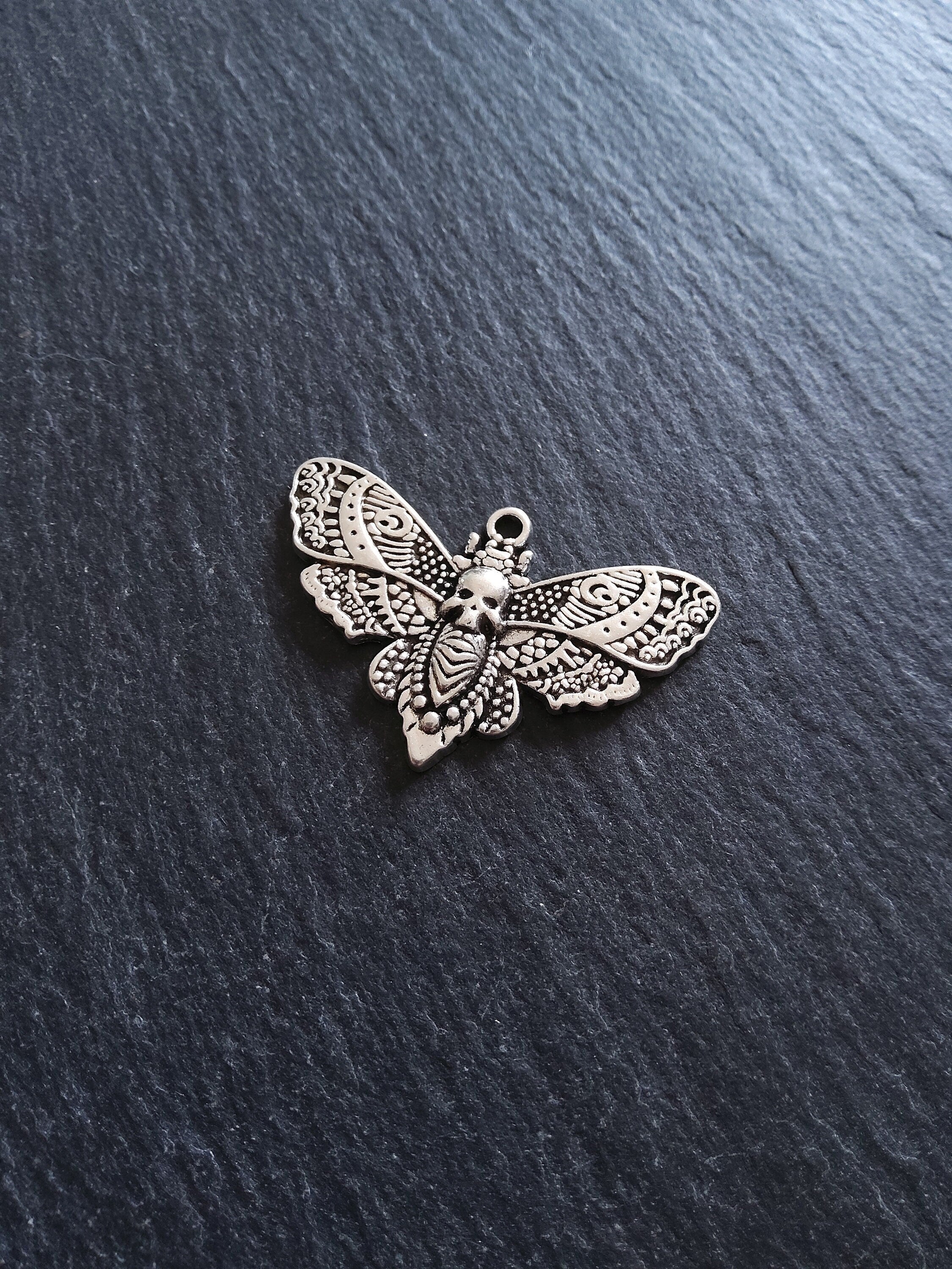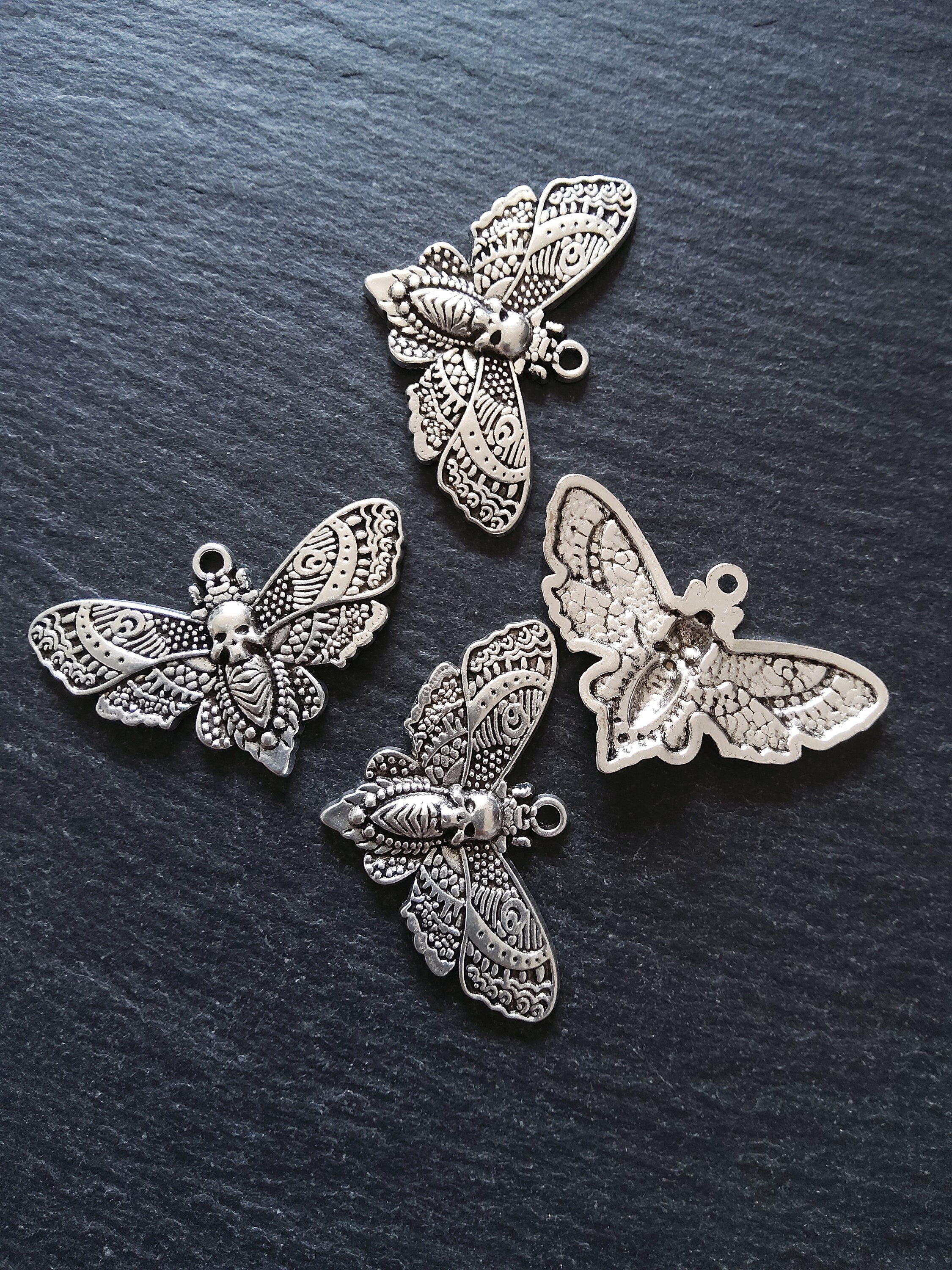 Large antique silver tone zinc metal alloy deaths head moth charms.