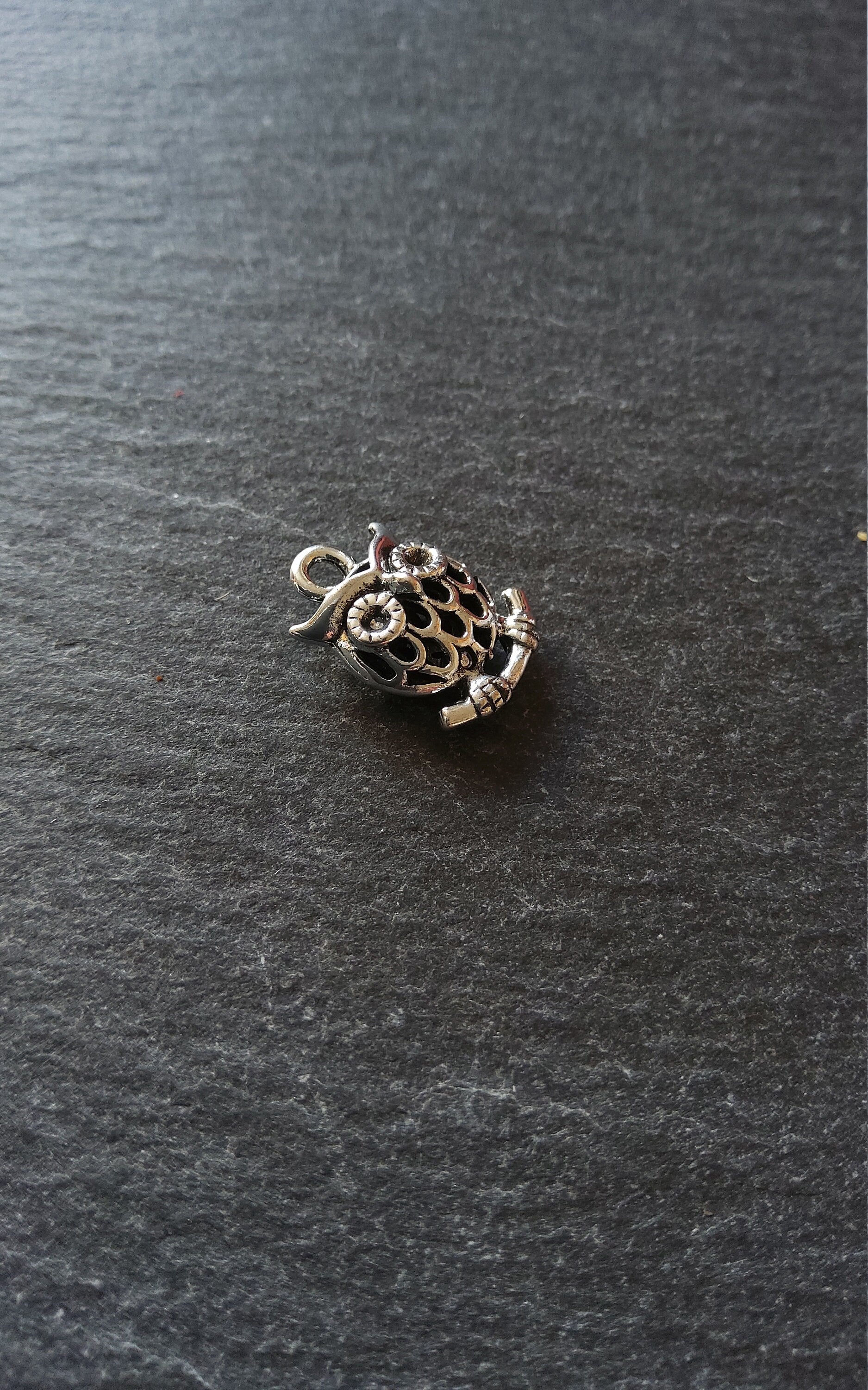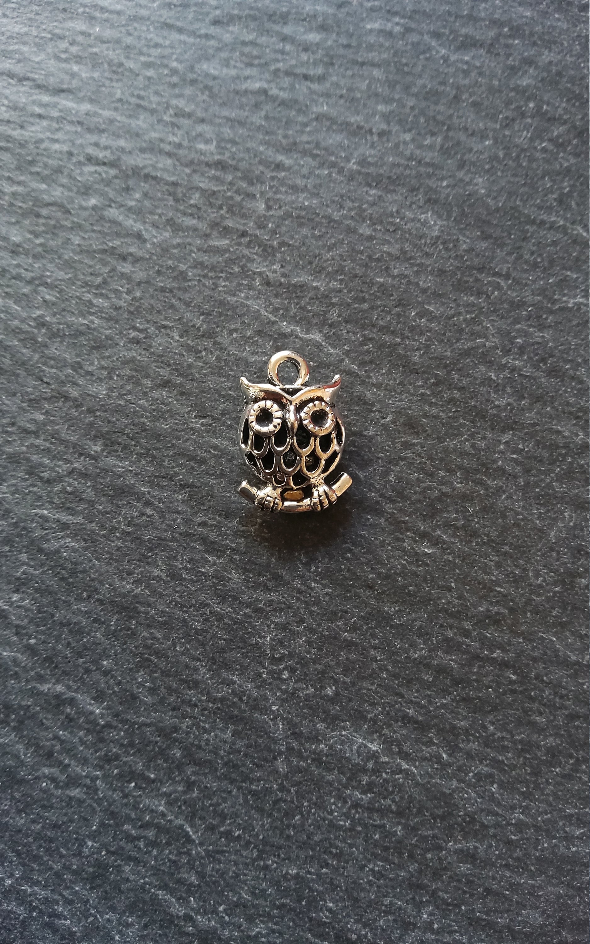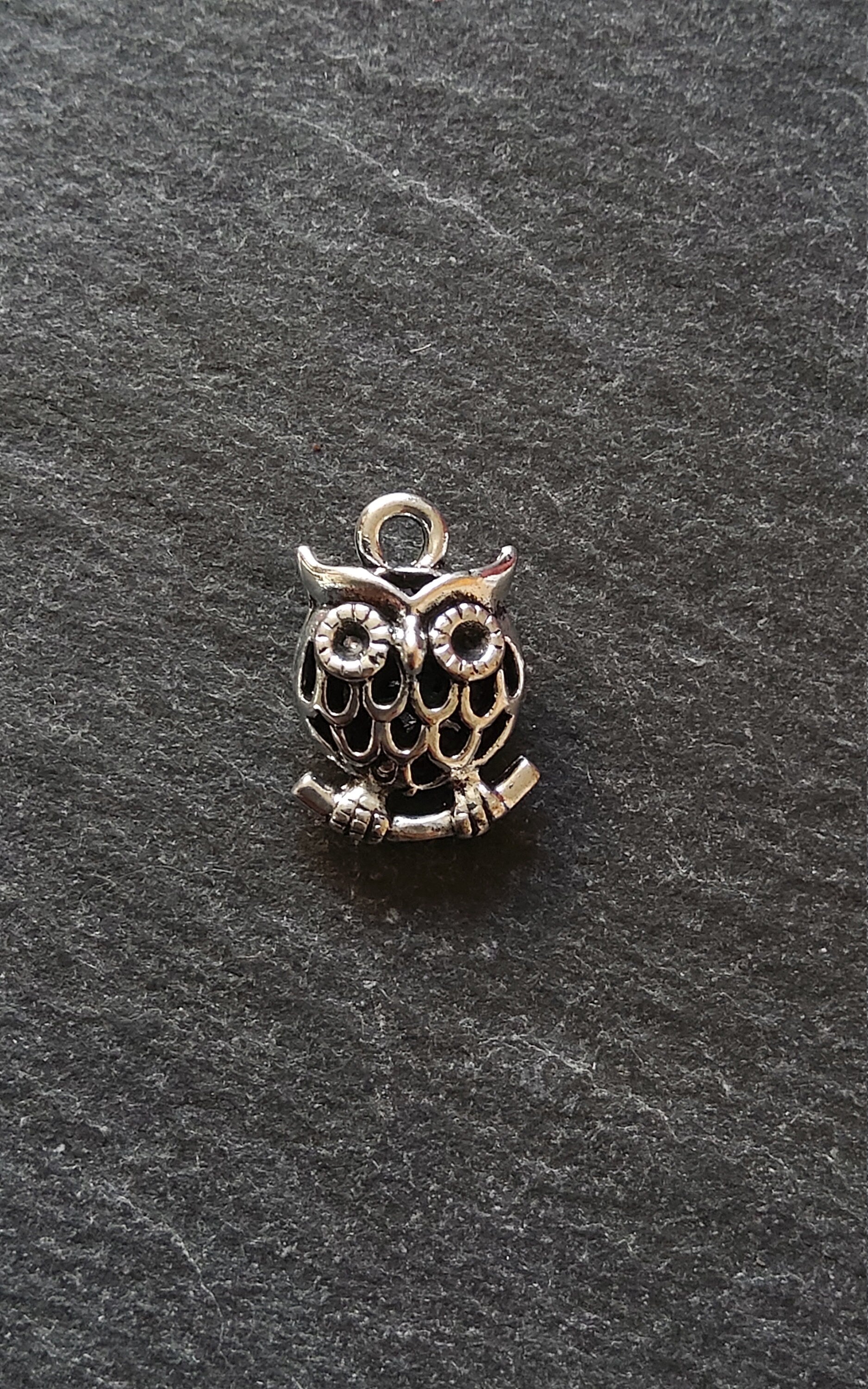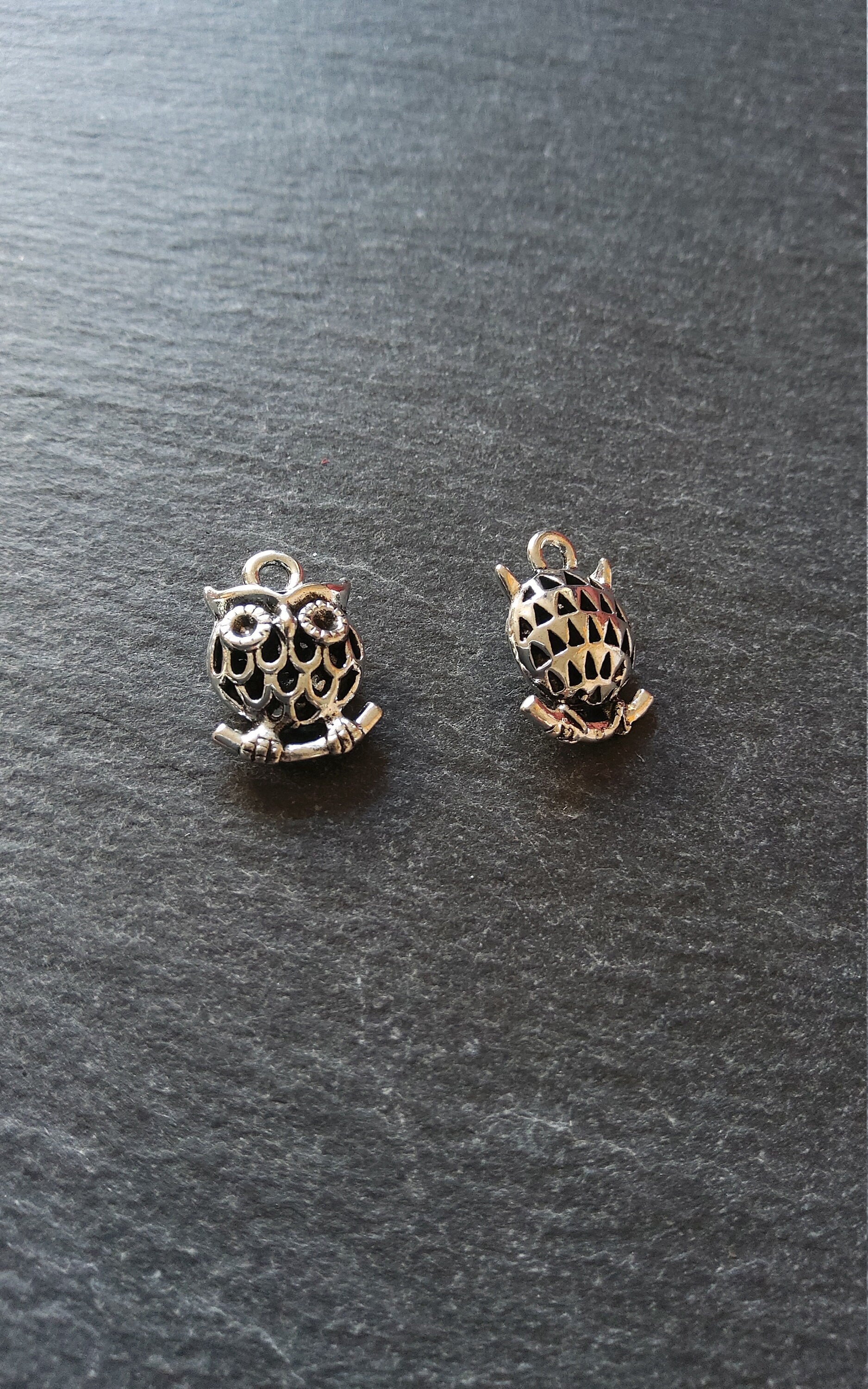 Cute little 3D hollow round antique silver tone 'Owl on a branch' charms.
