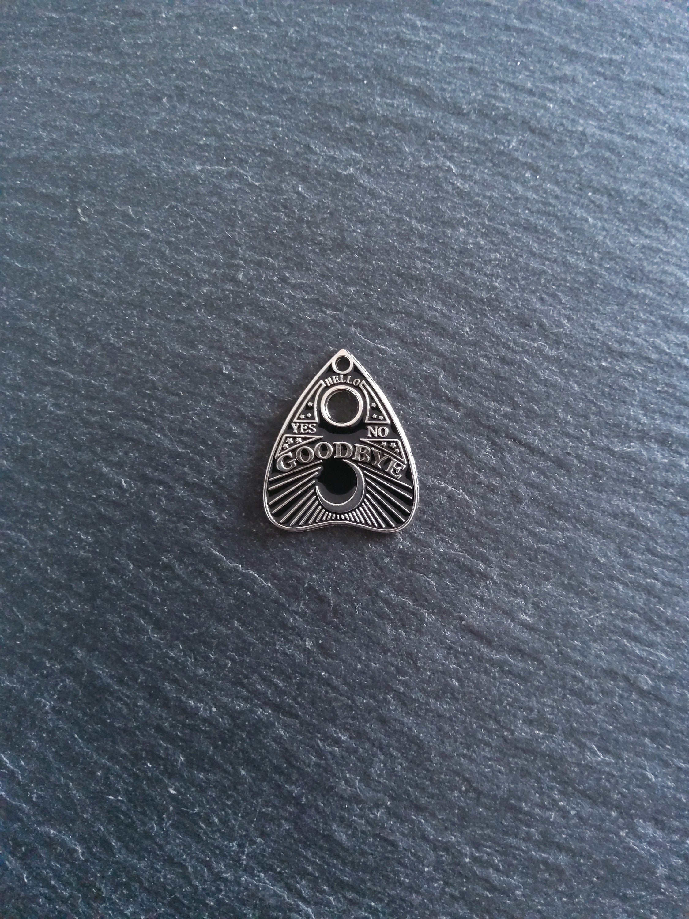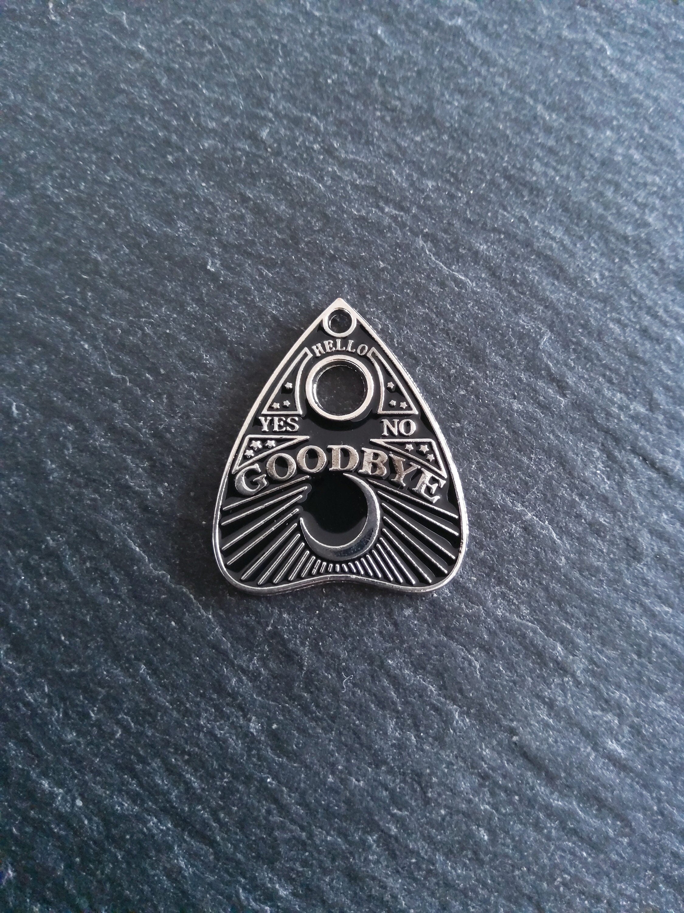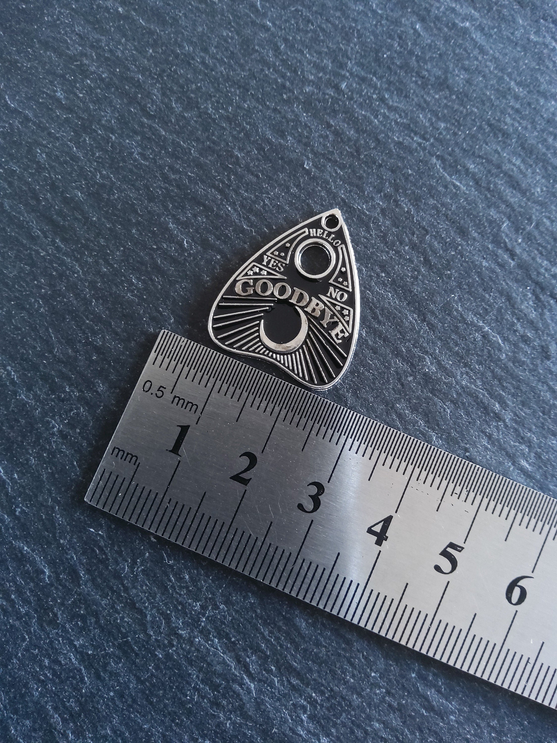 Silver tone metal alloy Ouija 'Goodbye' planchette charm with black enamel.
