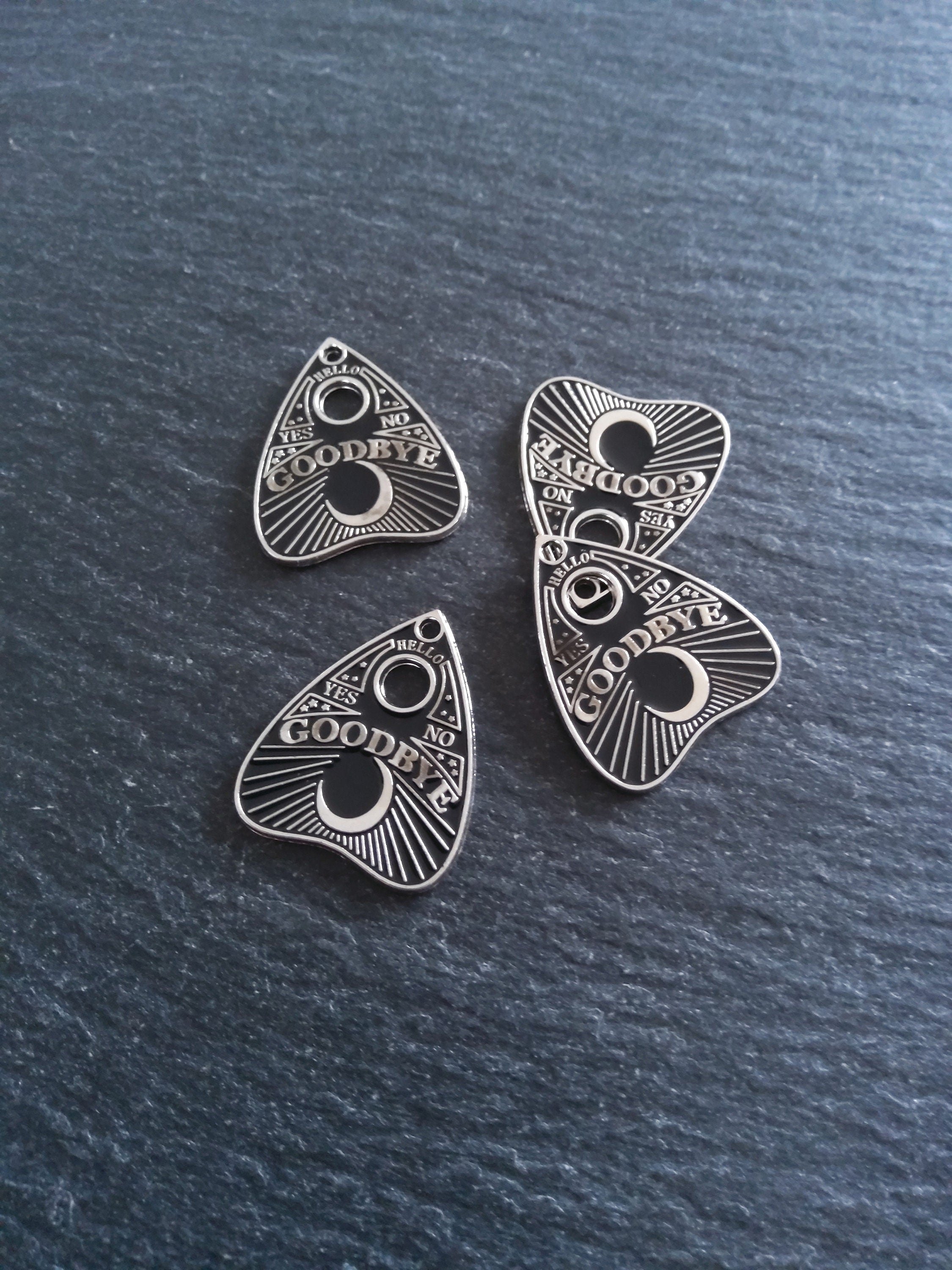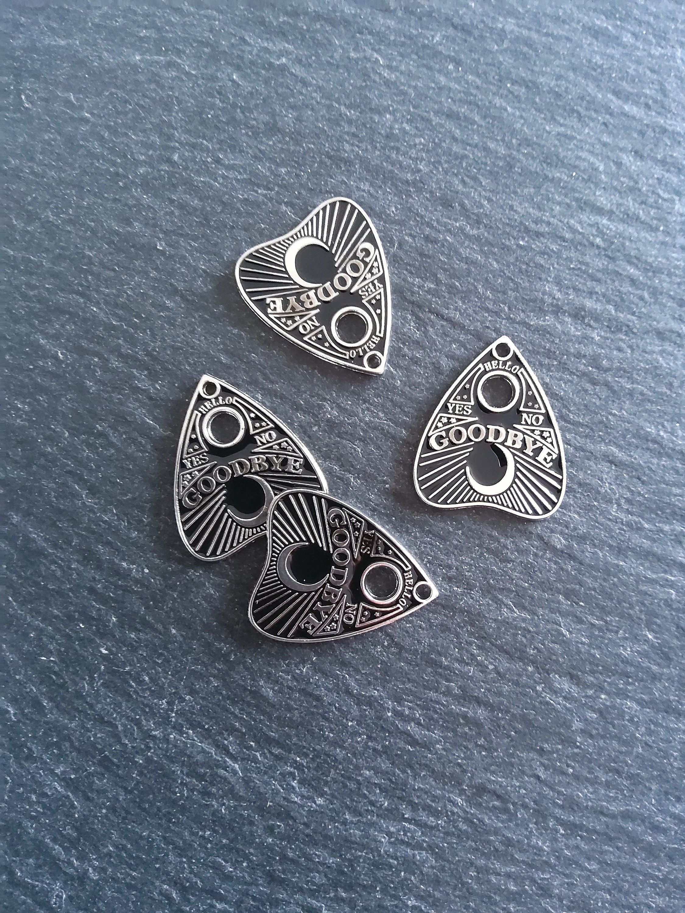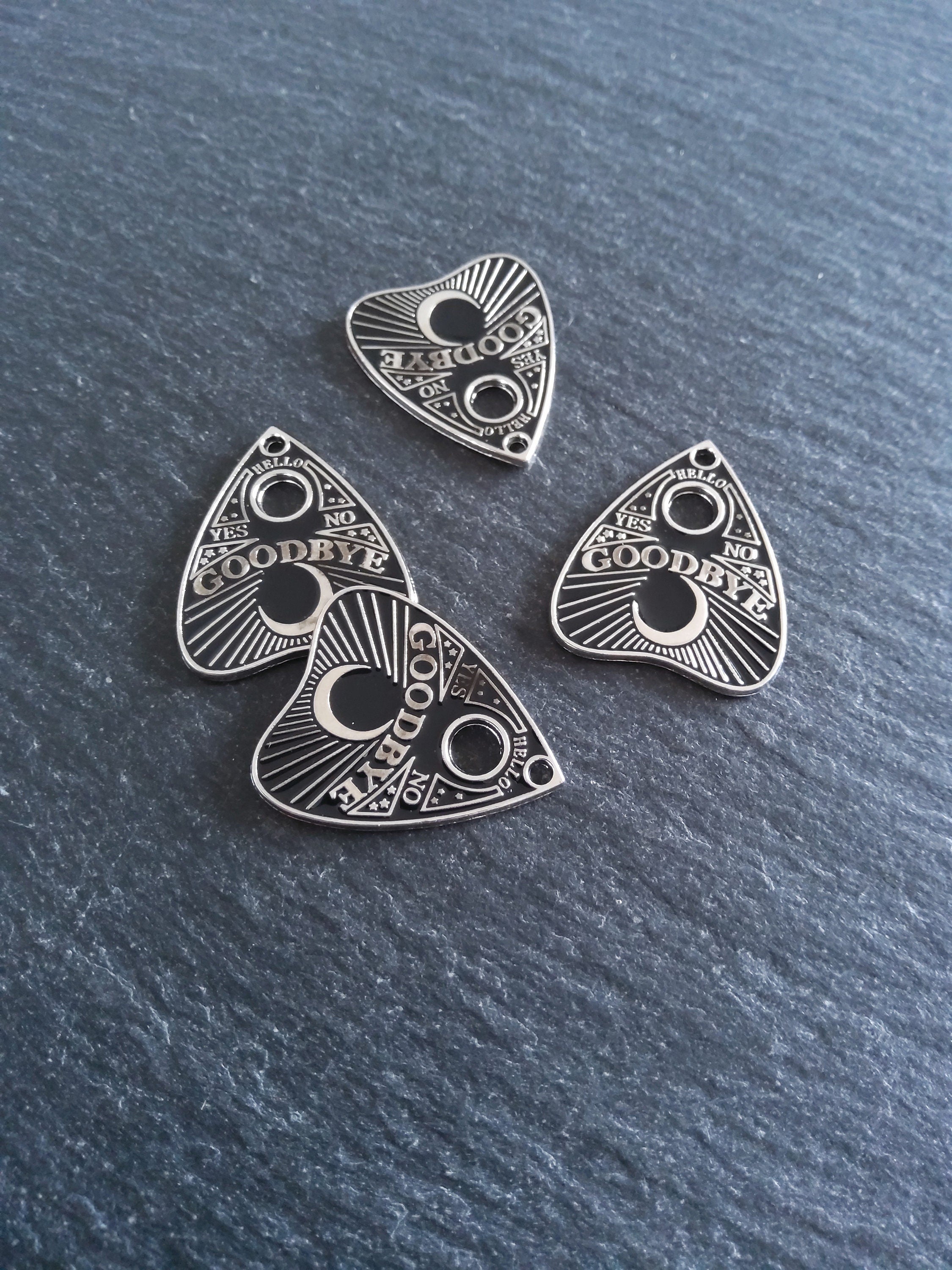 Silver tone metal alloy Ouija 'Goodbye' planchette charm with black enamel.