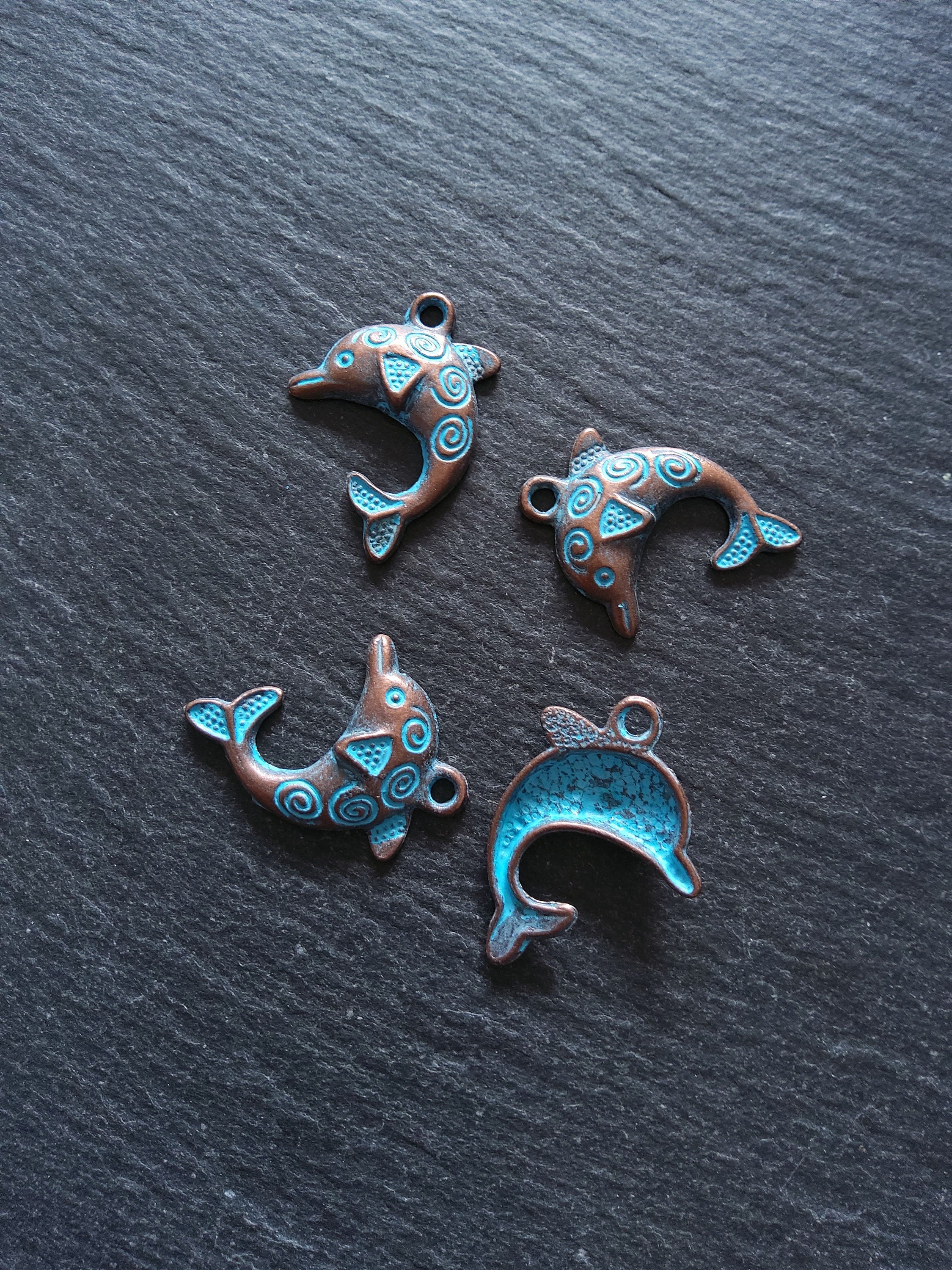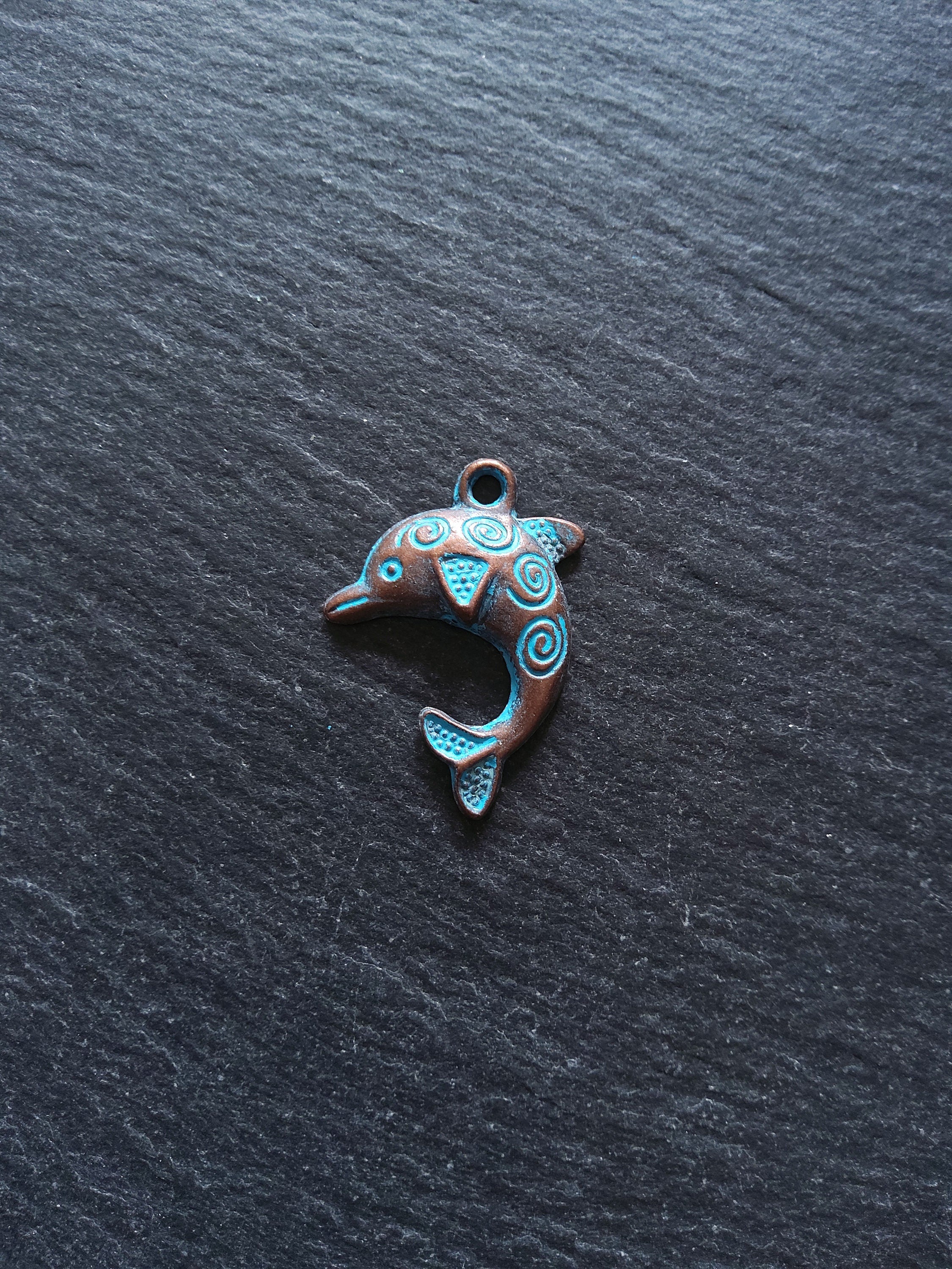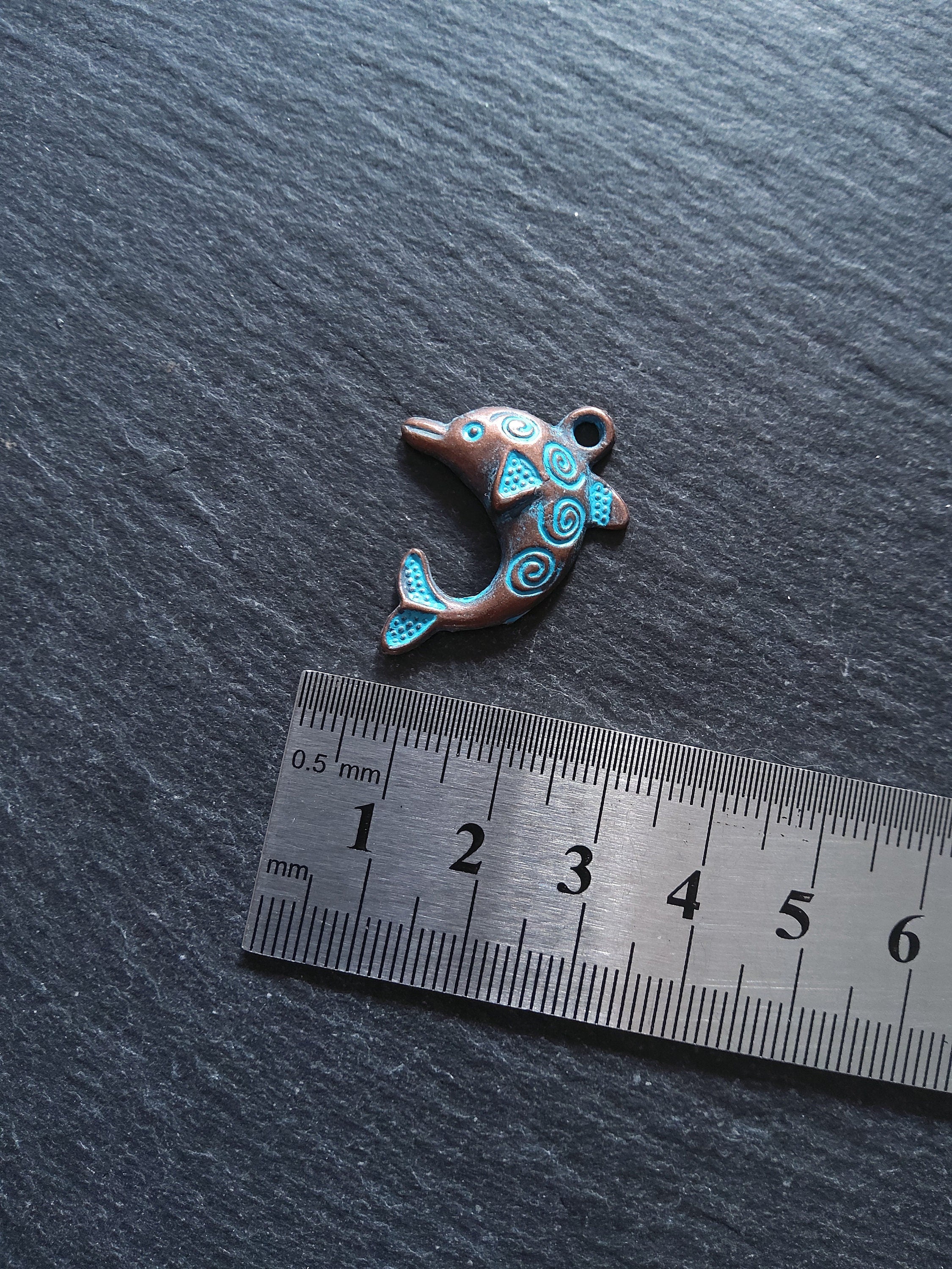 Antique copper tone zinc metal alloy dolphin charms with a blue patina.