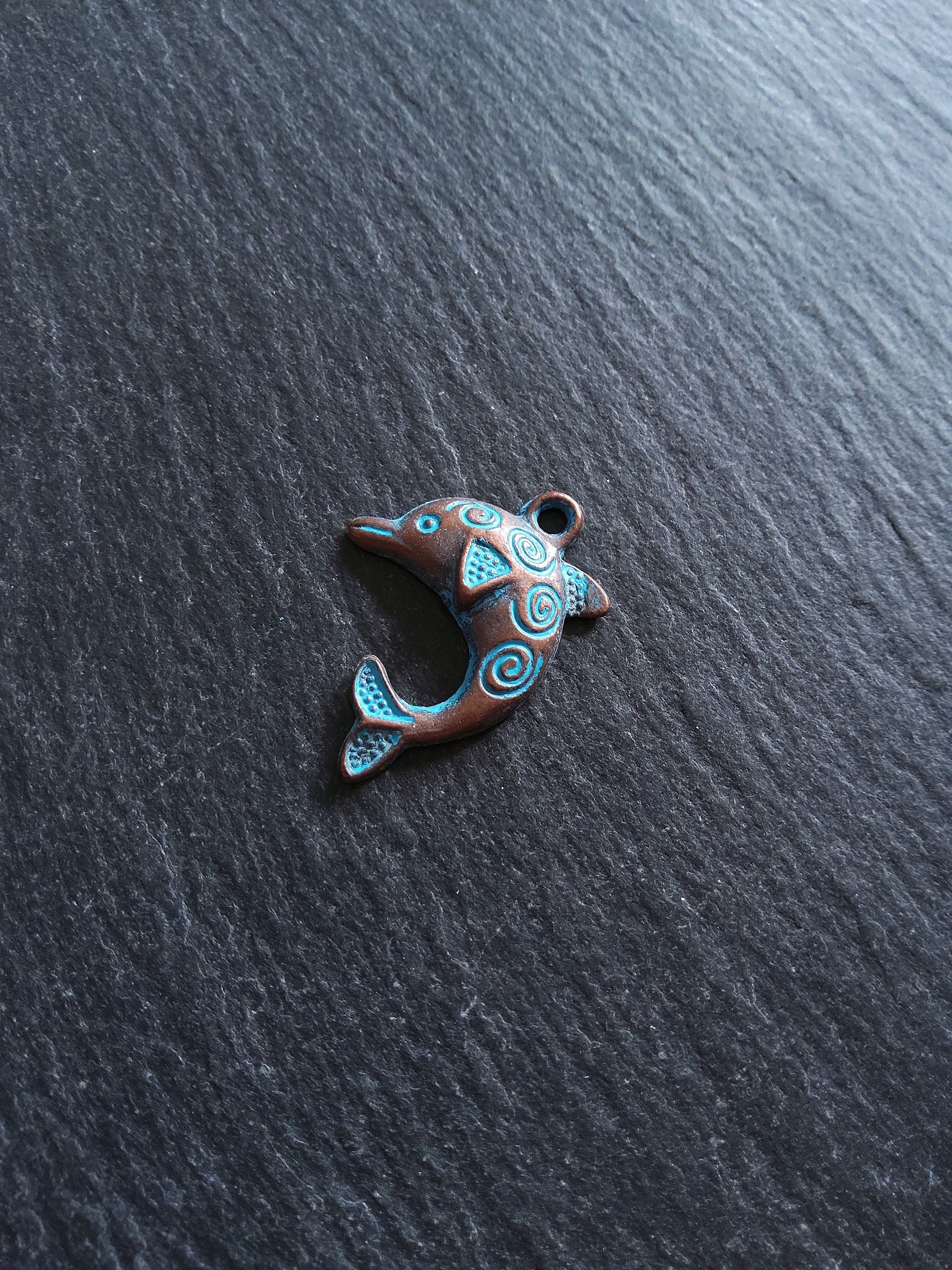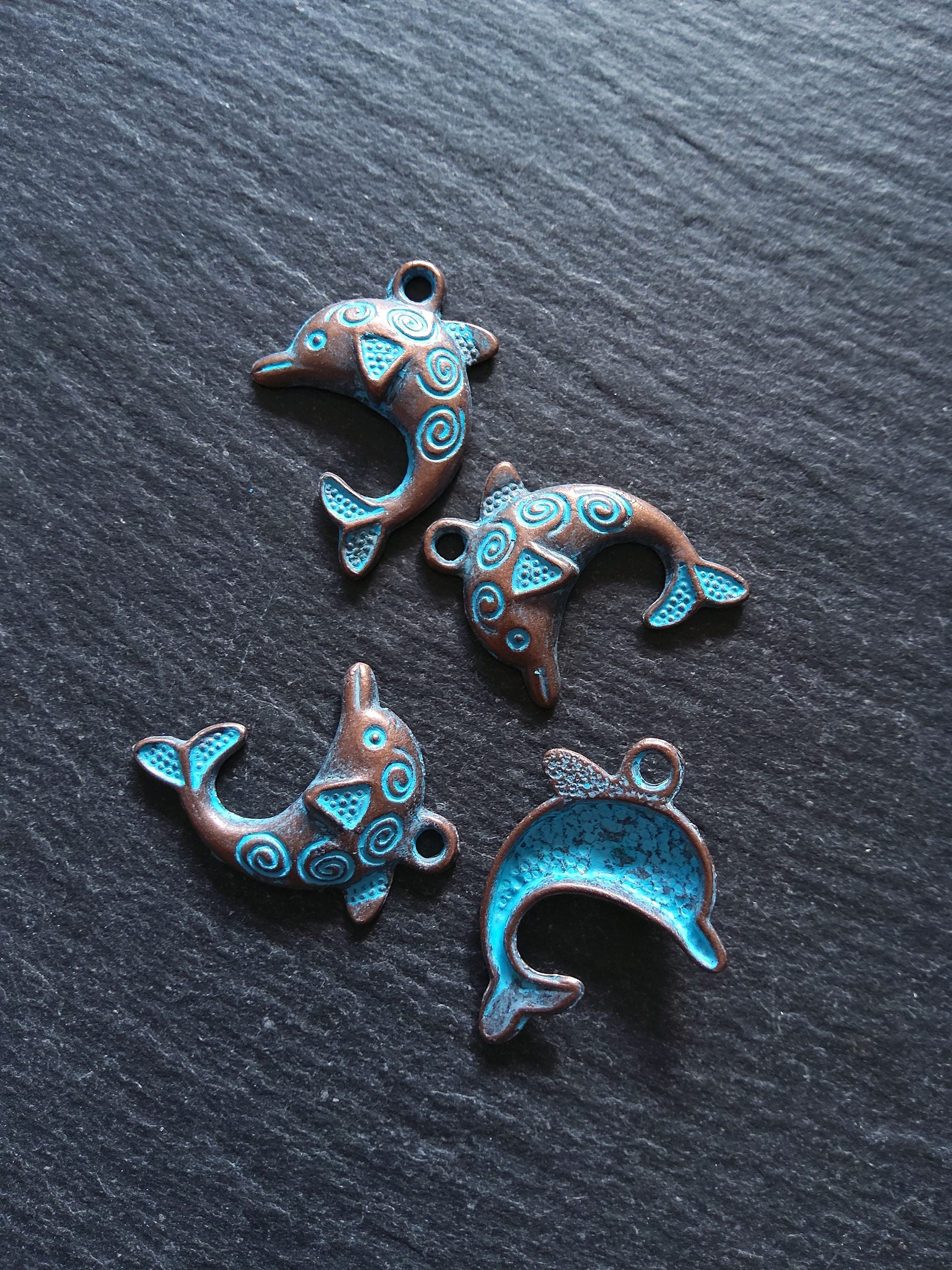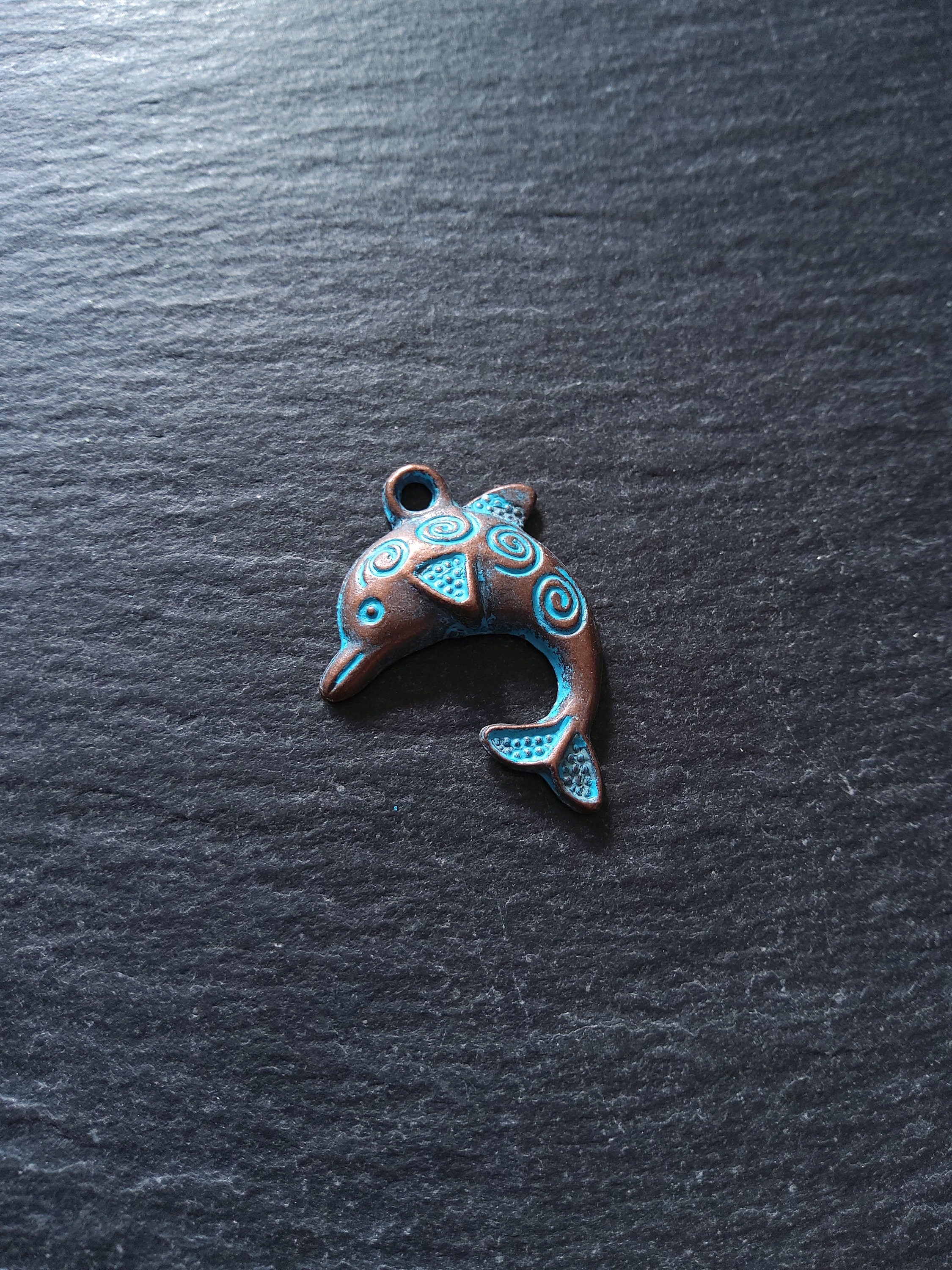 Antique copper tone zinc metal alloy dolphin charms with a blue patina.