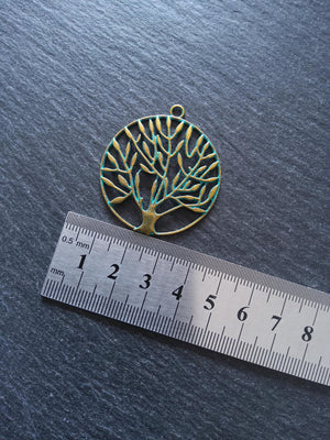 Large round tree pendants in antique bronze tone zinc metal alloy with green patina.