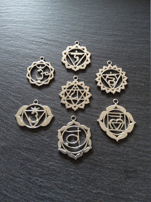 1 Full Set of the Seven Chakras Pendants in Antique Silver Tone Metal Alloy.