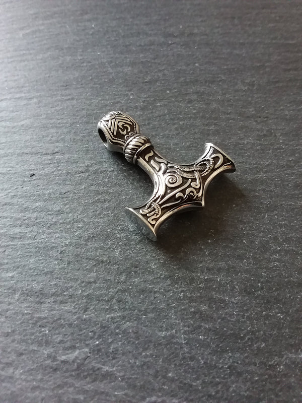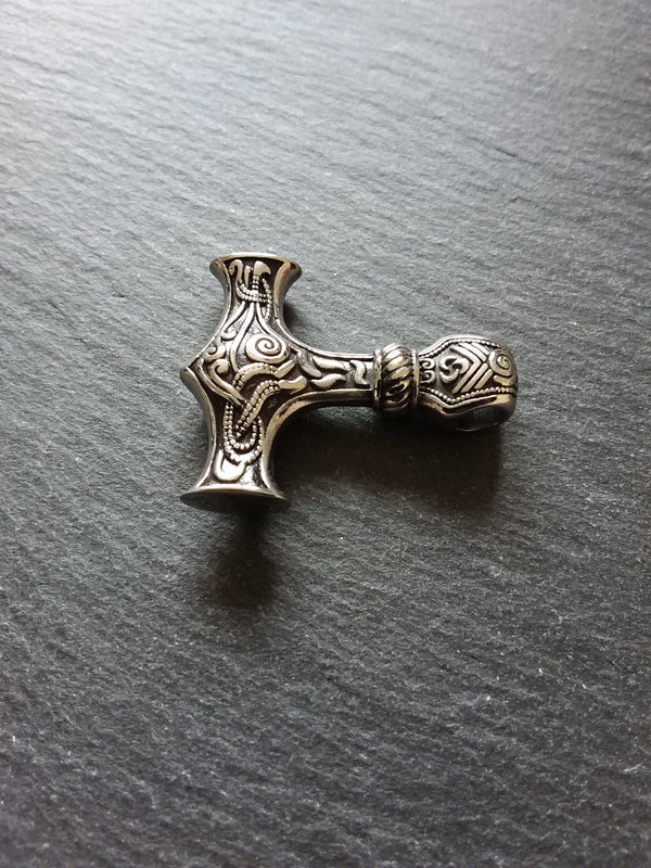 Solid & heavy 304 Stainless Steel silver tone Nordic Thor's Mjolnir Hammer pendant. Double sided