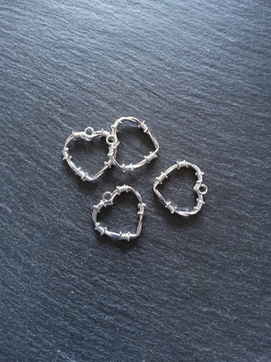Antique silver tone barbed wire heart charms.