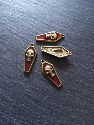 Coffin shaped antique bronze charms with skull on dark red enamel.