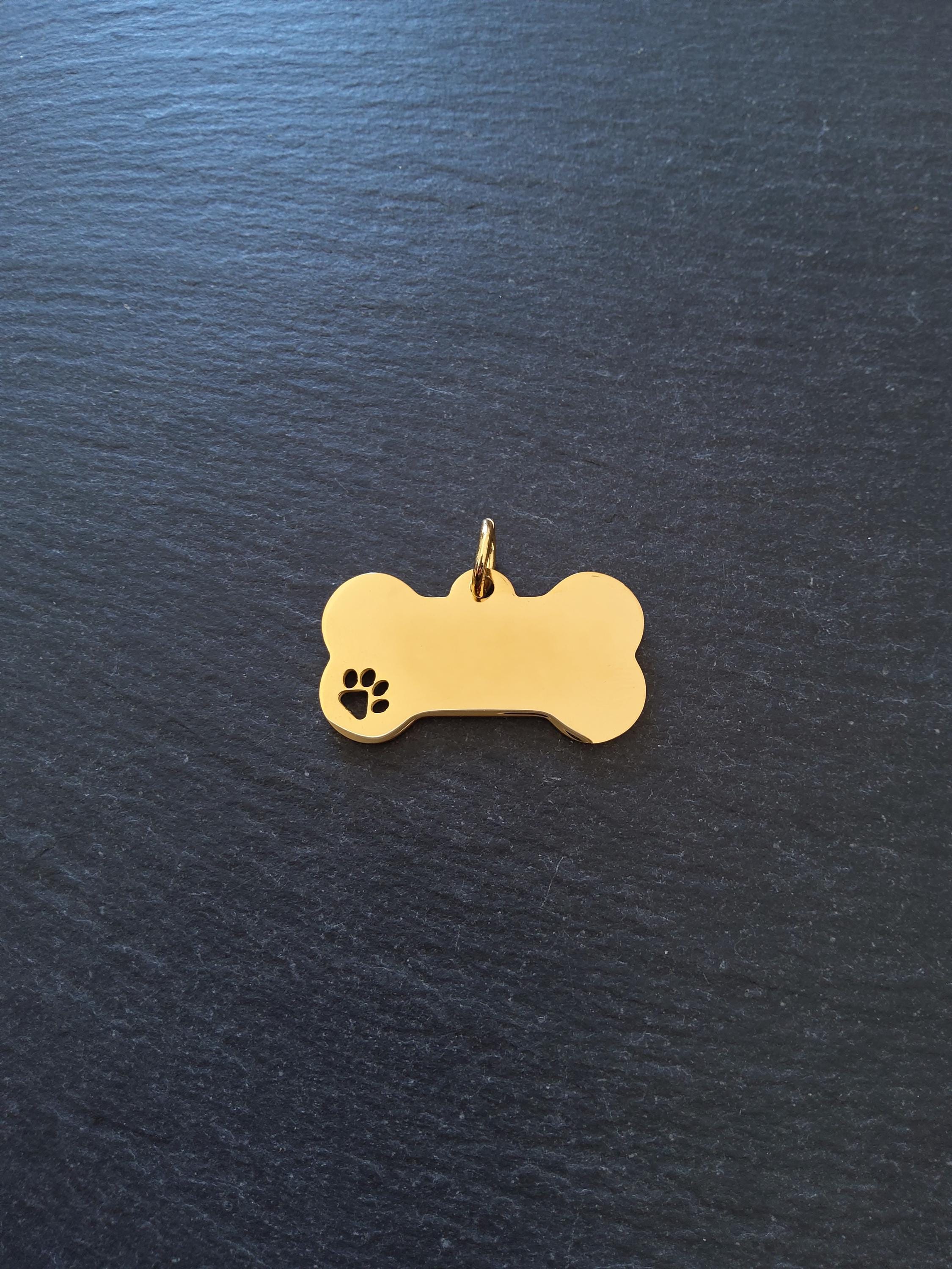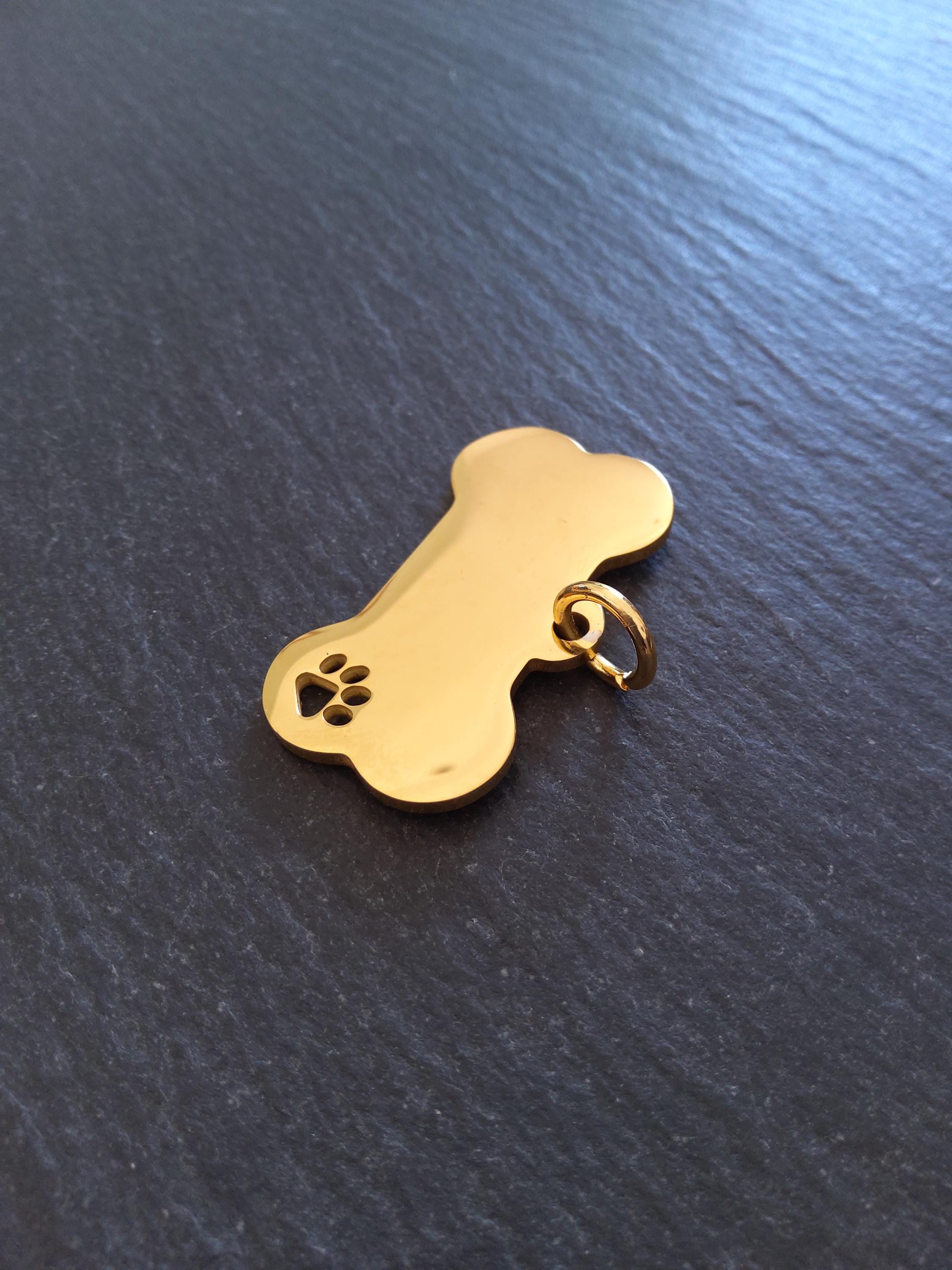 Large bright gold 201 Stainless Steel bone shaped dog tag charm with cutout paw design & ring.